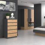 Płyta wiórowa laminowana wyróżnia się odpornością na naprężenia mechaniczne i ekstremalne temperatury, Szuflady – na prowadnicach rolkowych to gwarancja wygodnego, a przede wszystkim bezpiecznego użytkowania., Meble do samodzielnego montażu, Gładkie boki bez zaślepek i widocznych otworów, Istnieje możliwość dokupienia oświetlenia szafkowego LED., Bezuchwytowe fronty, Zdjęcia zestawów przedstawiają przykładową aranżację z innymi meblami z kolekcji. Pozostałe bryły są dostępne w osobnej sprzedaży., Obrzeża – wykończone tworzywem PCV (charakteryzującym się dużą wytrzymałością mechaniczną i chemiczną)