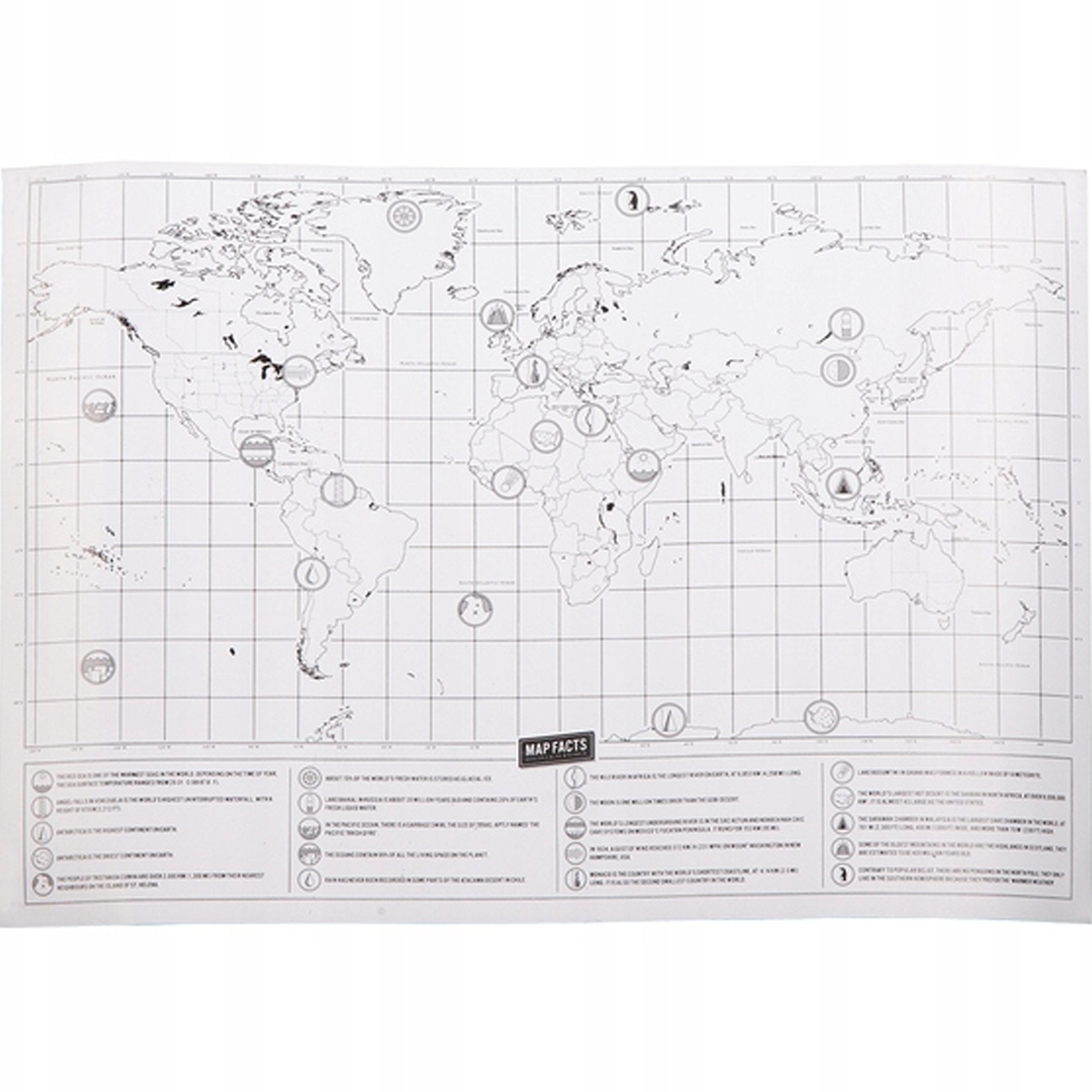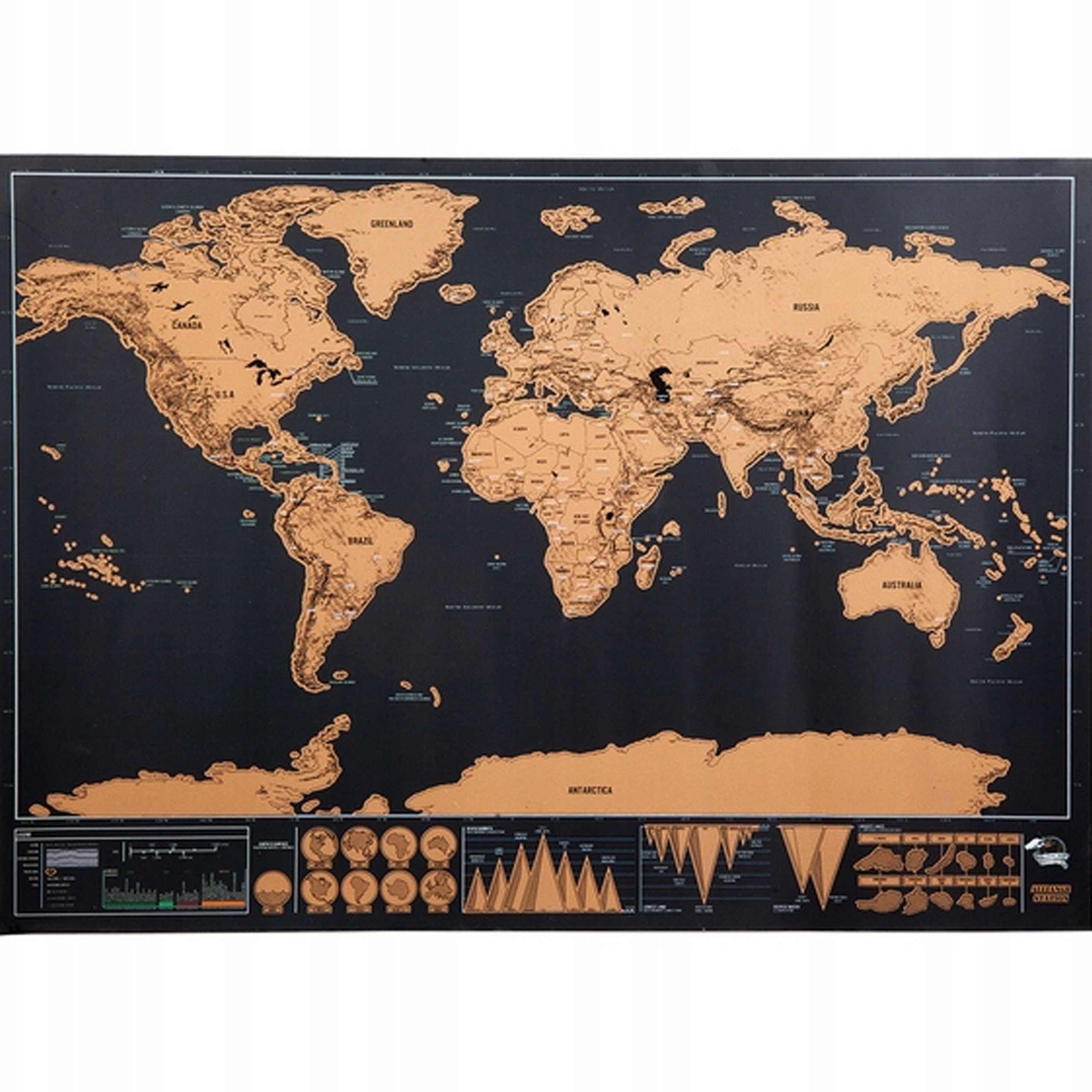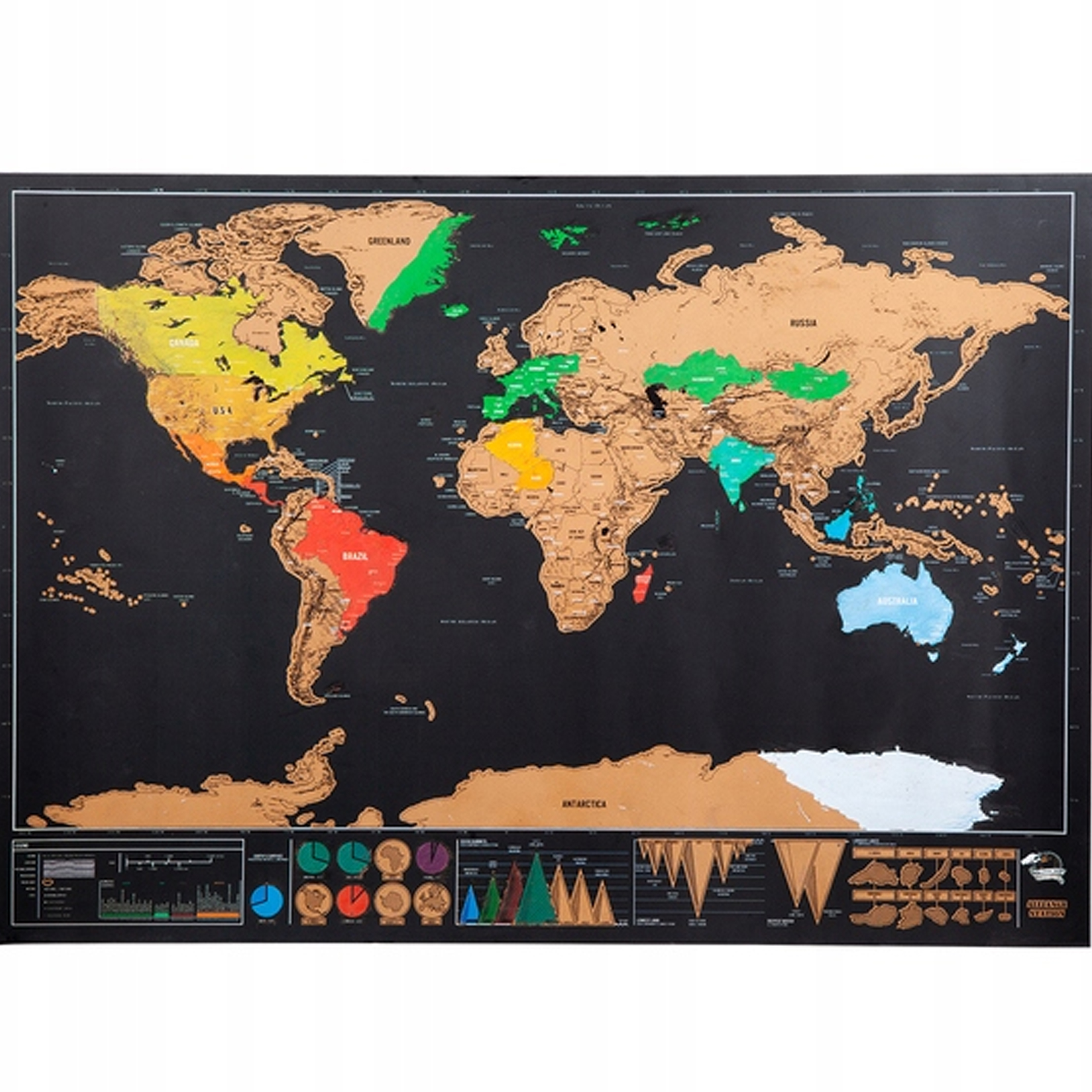 Mapa zdrapka to idealny prezent dla każdego podróżnika jak również dla miłośników geografii świata oraz najmłodszych fanów zdrapek, czyli dzieci. Mapa jest dokładnie opisana. Uwzględniono na niej szerokości i długości geograficzne, wszystkie kontynenty i państwa.