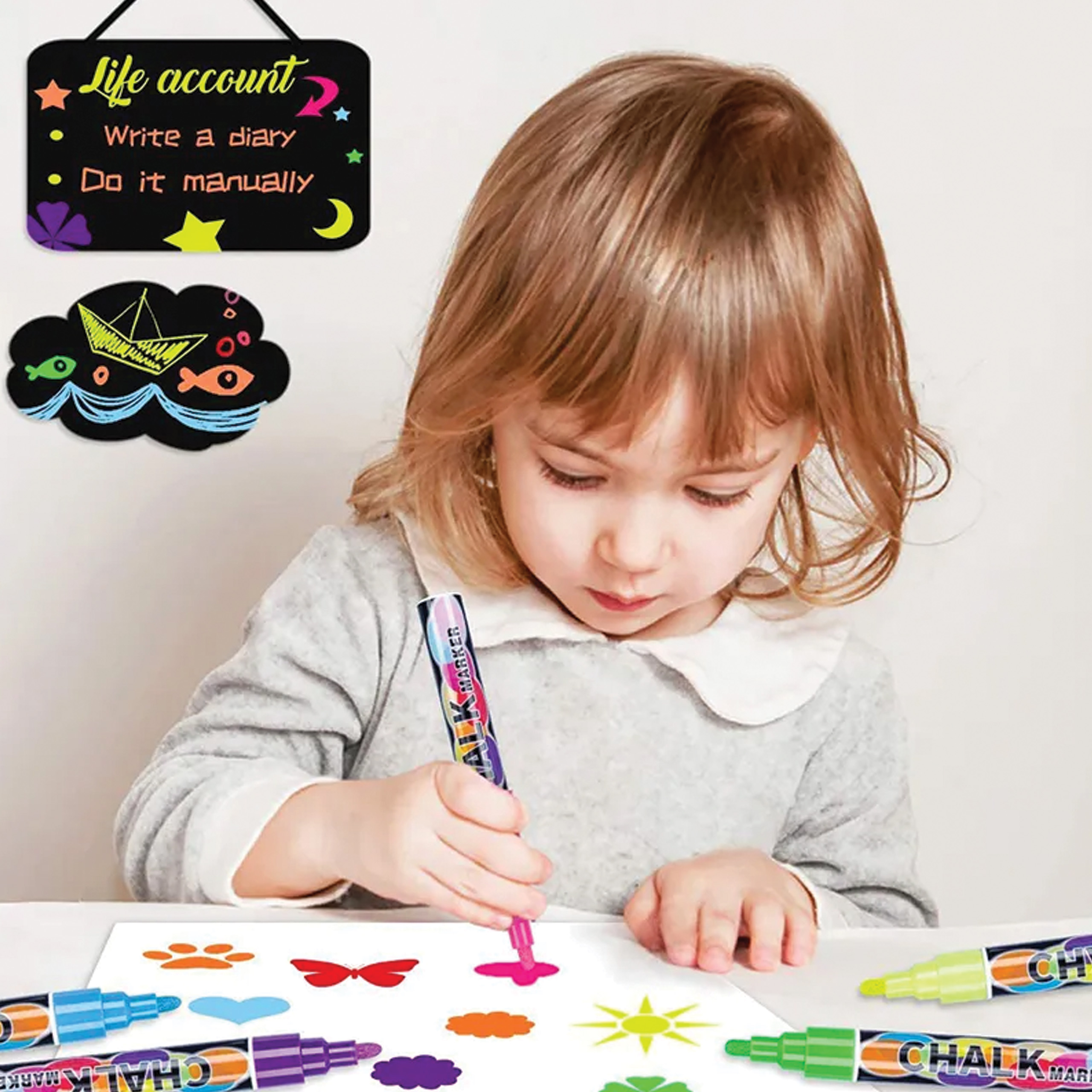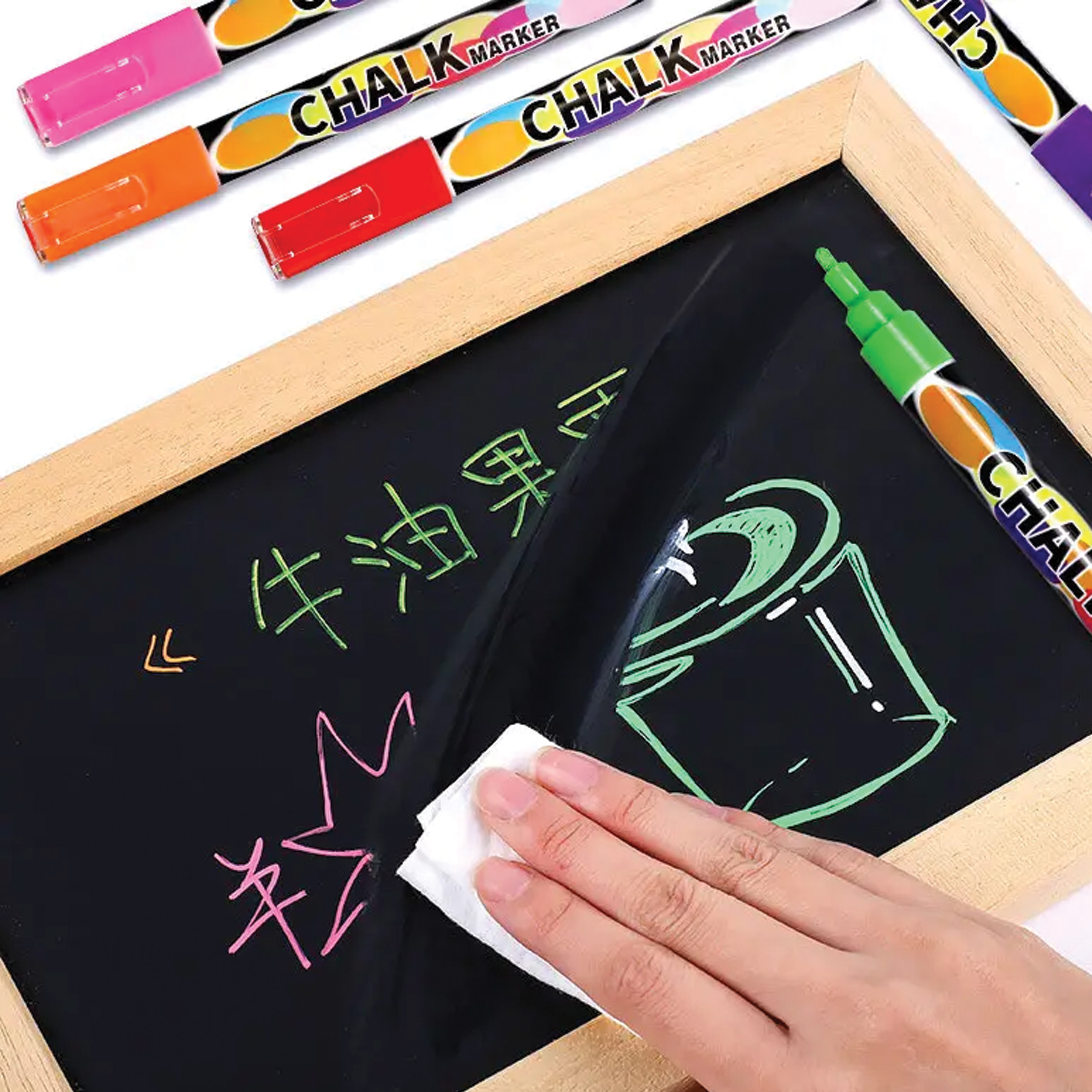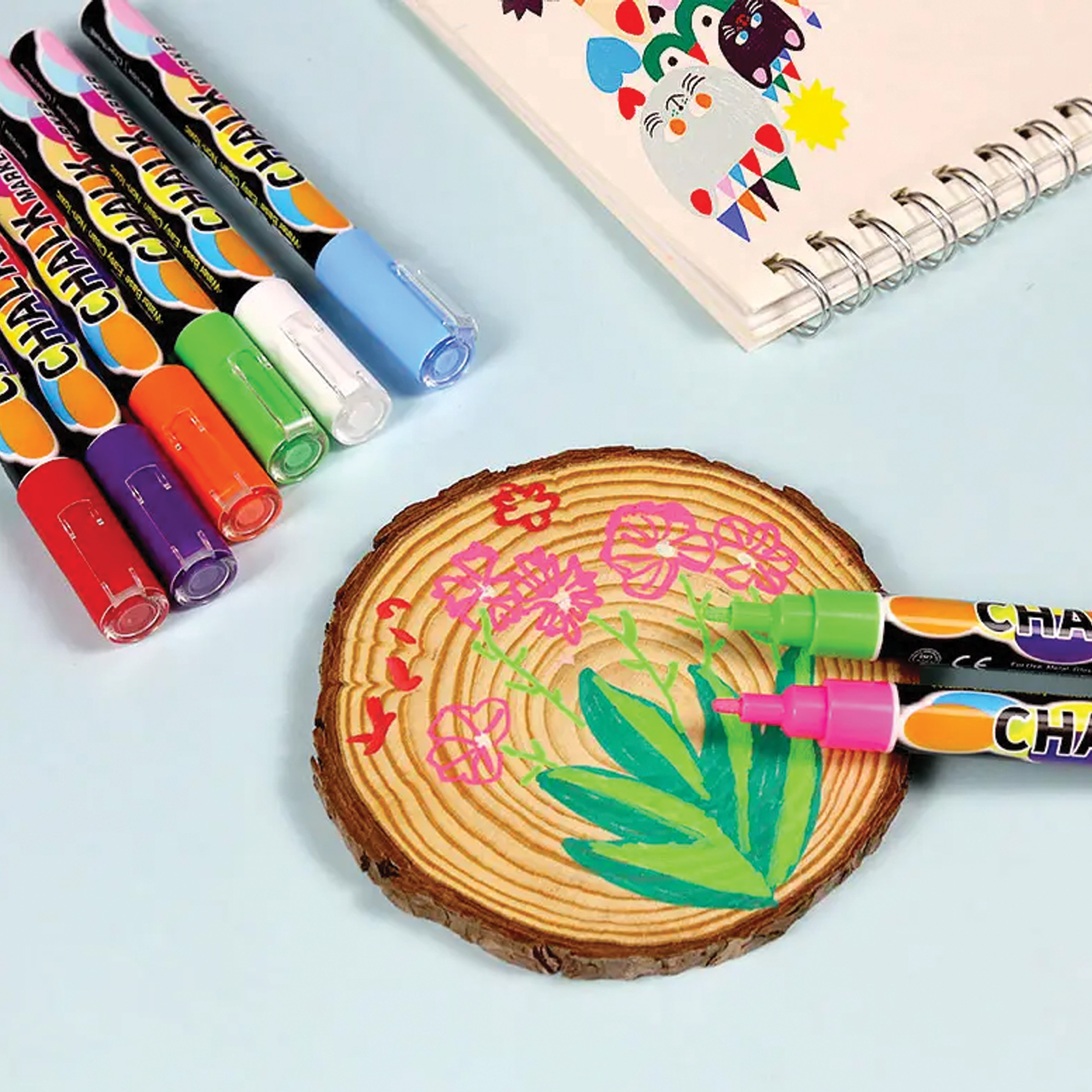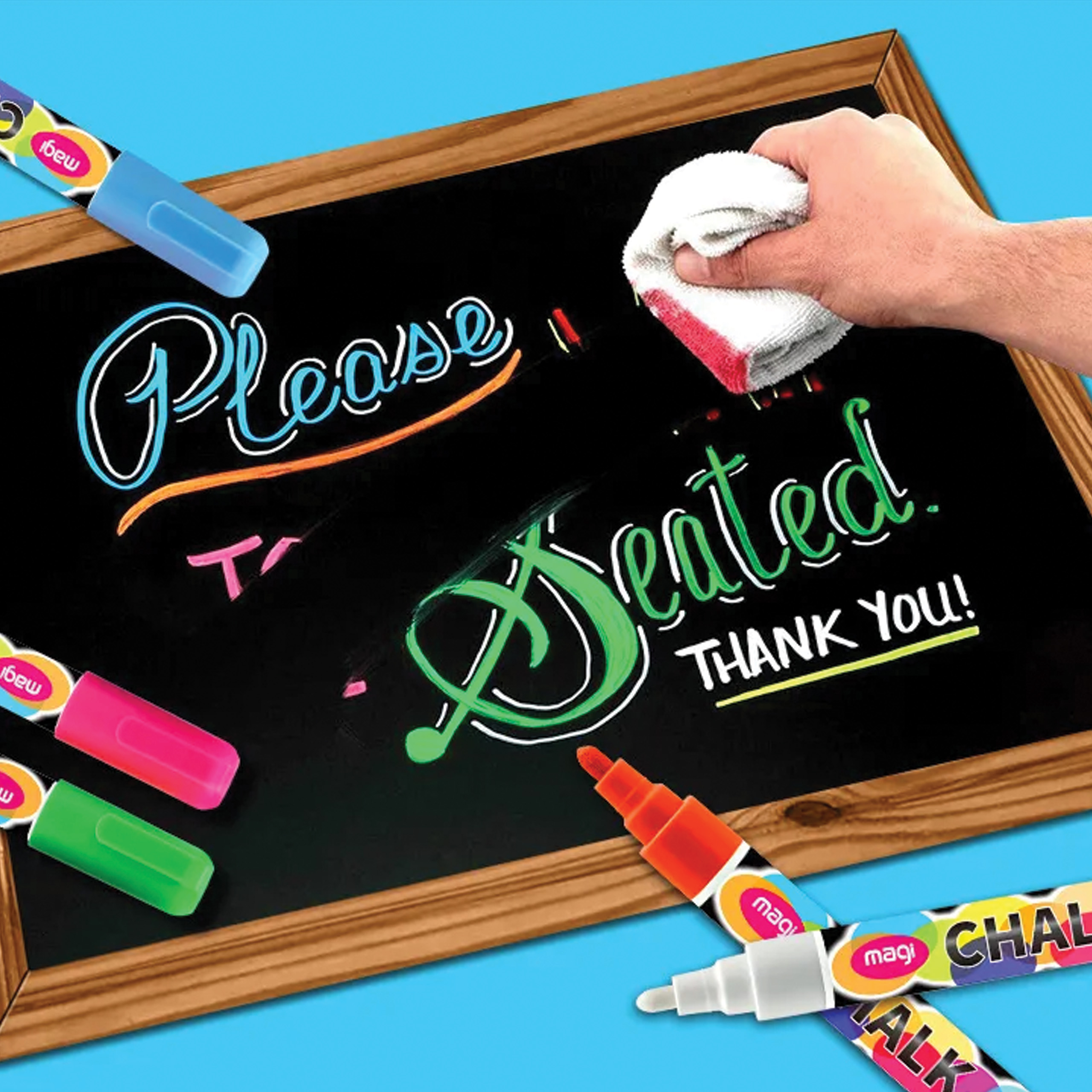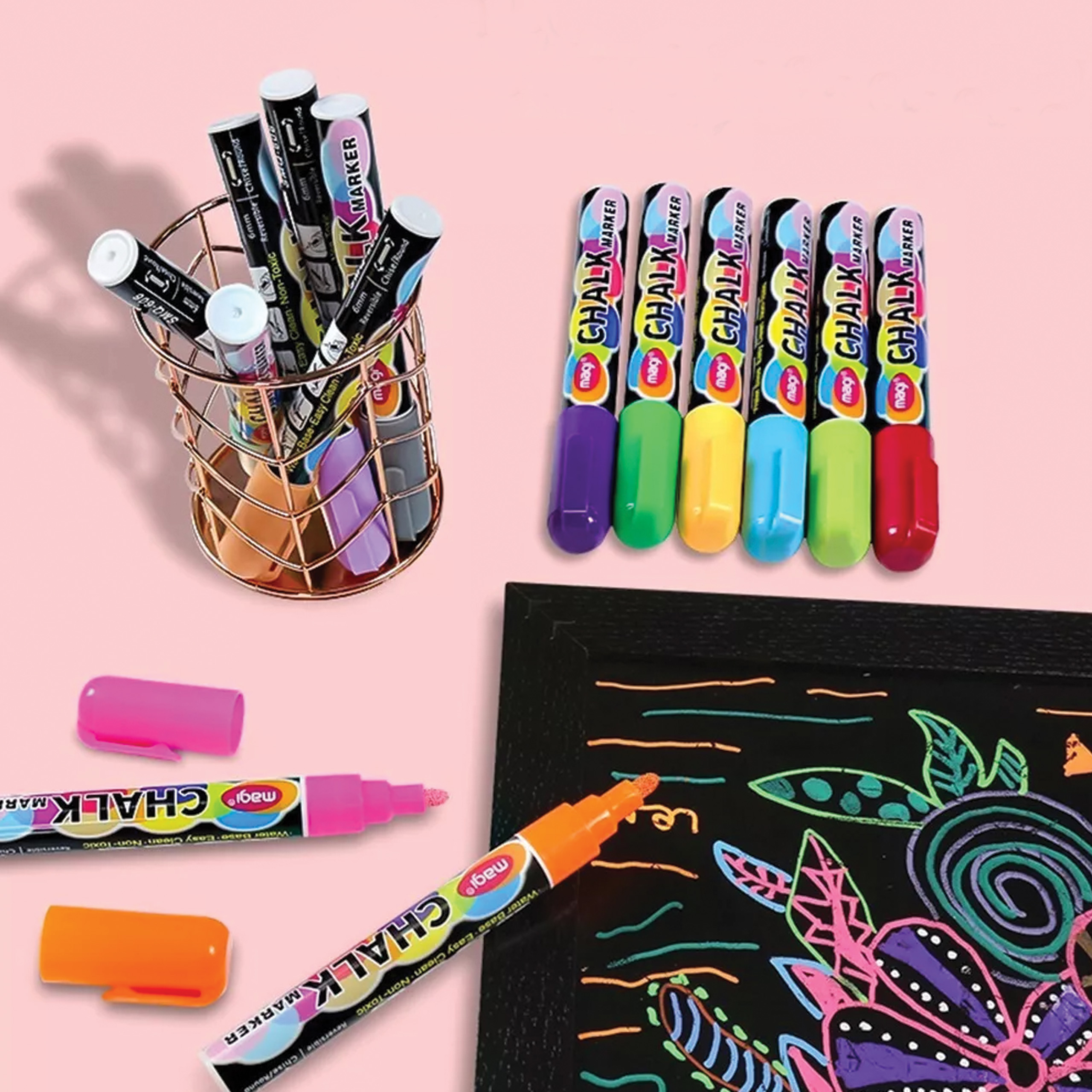Wysokiej jakości markery kredowe idealne dla różnego rodzaju tablic. Tusz który został użyty w markerach jest niepylący, dzięki czemu bezpiecznie mogą ich używać nawet dzieci. Struktura chemiczna płynnego tuszu sprawia że jest on dobrze przylegający do gładkich powierzchni takich jak tablice czy szkło.