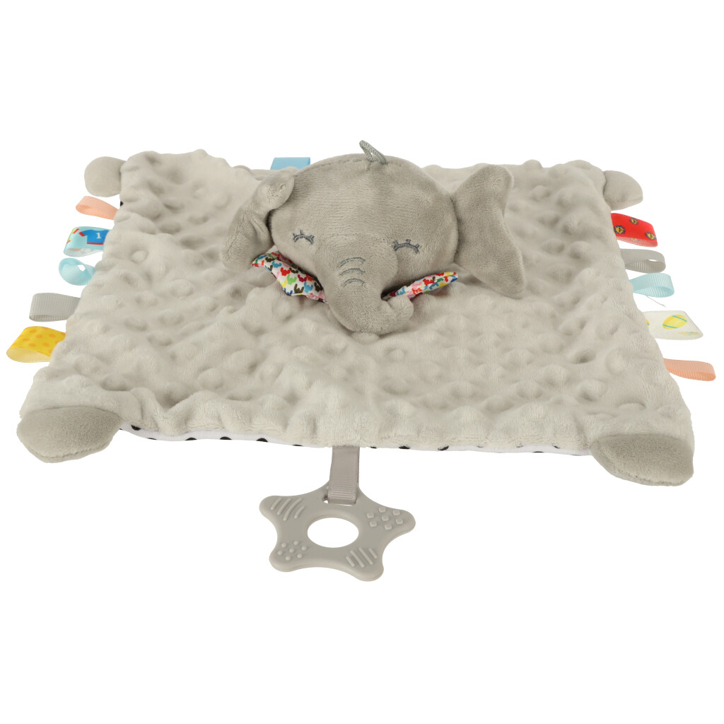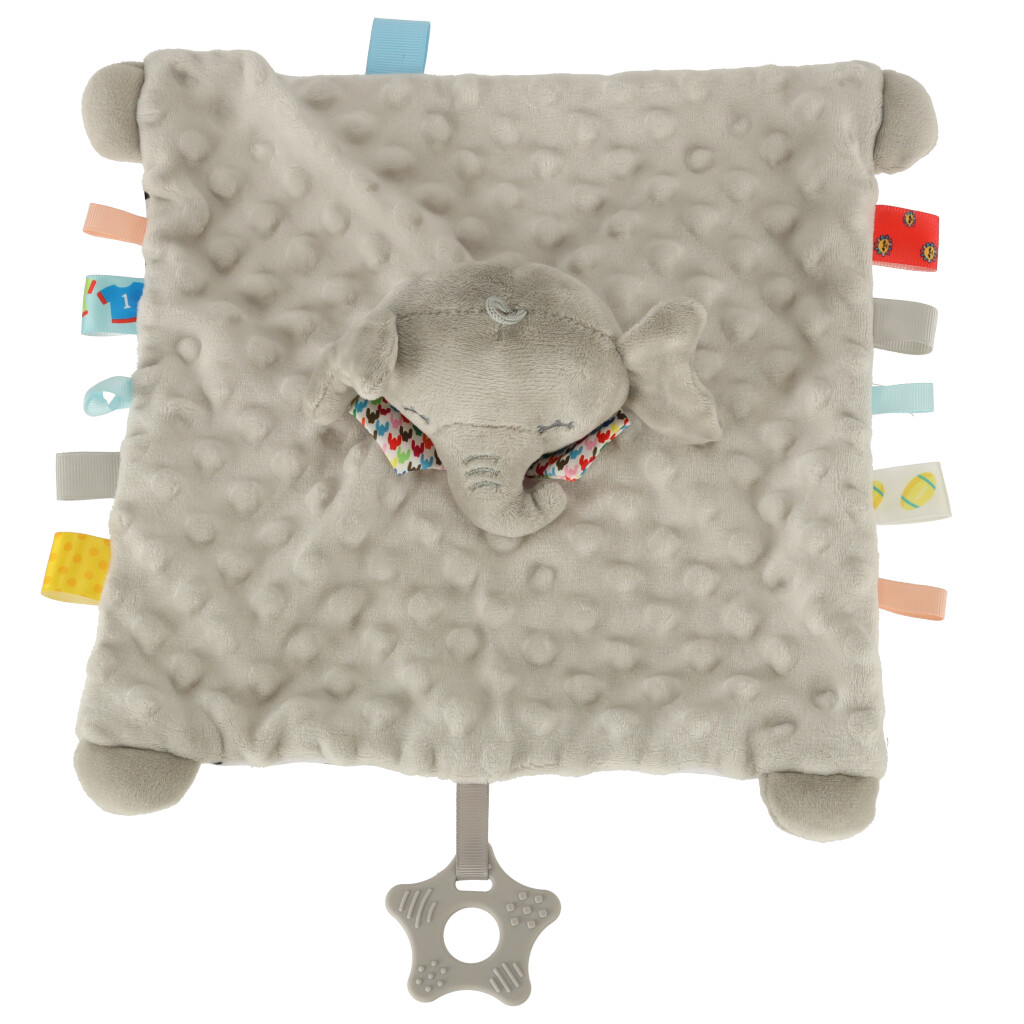 Miękka sensoryczna maskotka słonik. Posiada wiele elementów sensorycznych – teksturowany materiał, kolorowe metki, dzwoneczek oraz gryzak. Słonik stanie się najlepszym przyjacielem każdego malucha. Materiał: poliester, silikon. Wym. książeczki: 28x32x7cm.