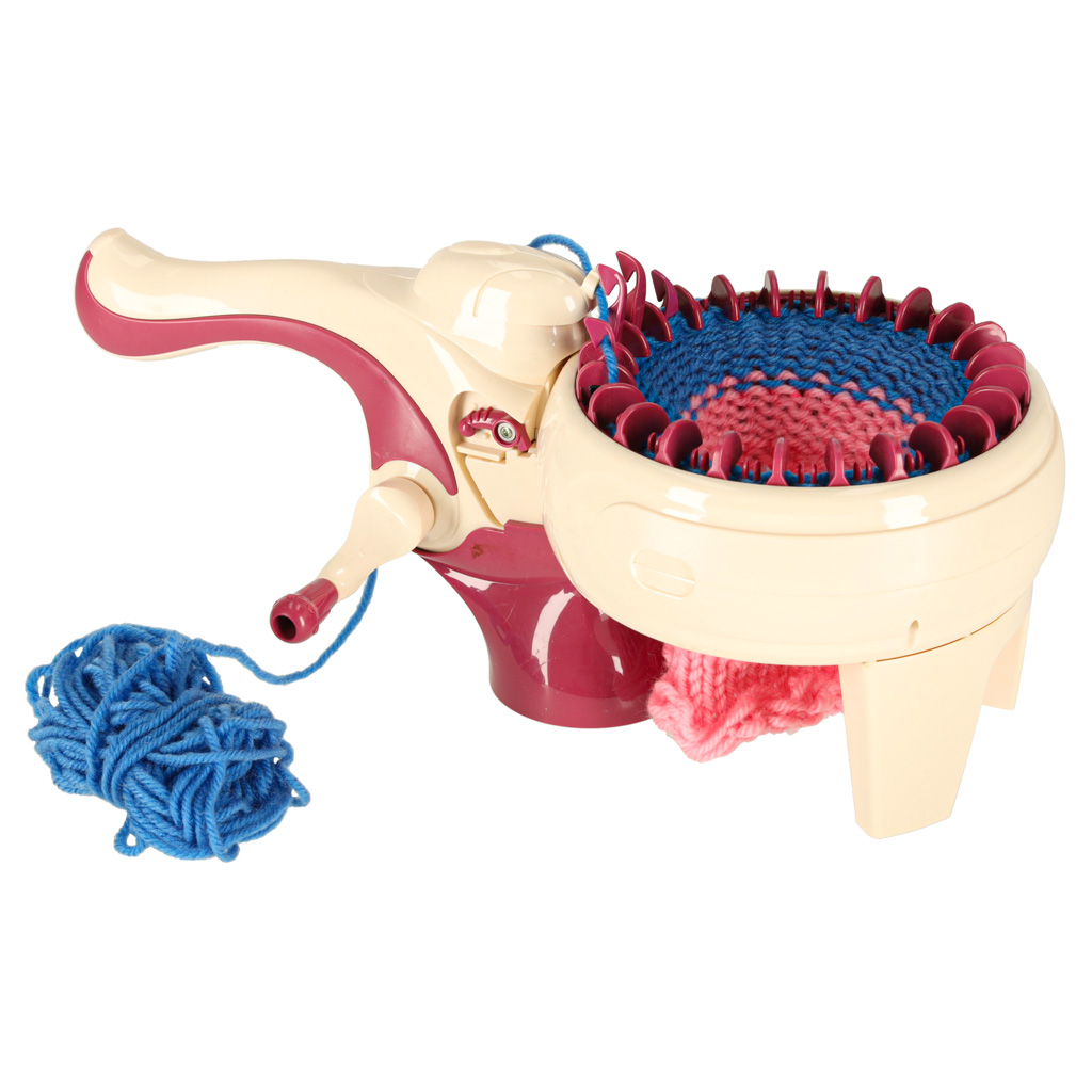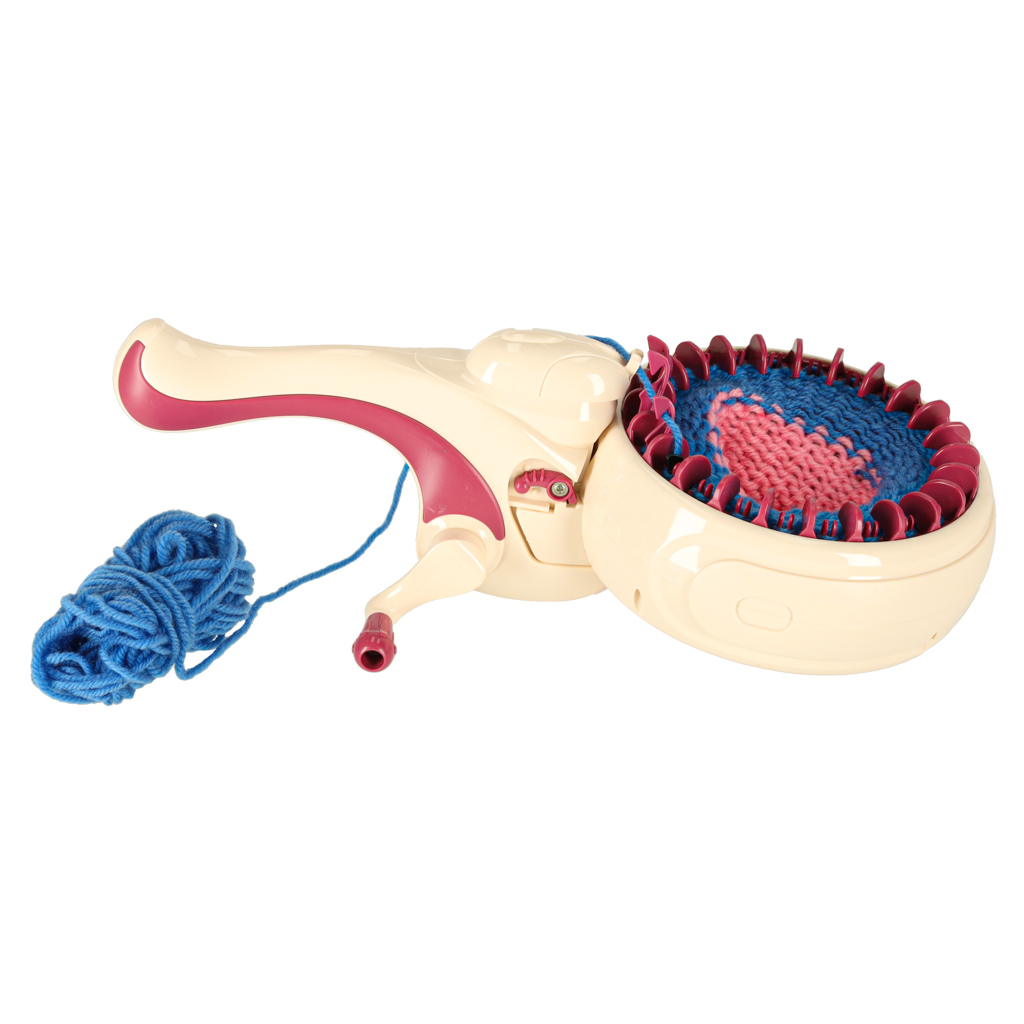 Maszynka dziewiarska dla dzieci 6+. Ręczny napęd korbkowy, dwa tryby pracy: okrągły i płaski. W zestawie: igła, szydełko, 5 motków włóczki (70% akryl, 30% wełna). Wymiary maszyny: 30×12 cm, obręcz robocza: 13,5 cm.