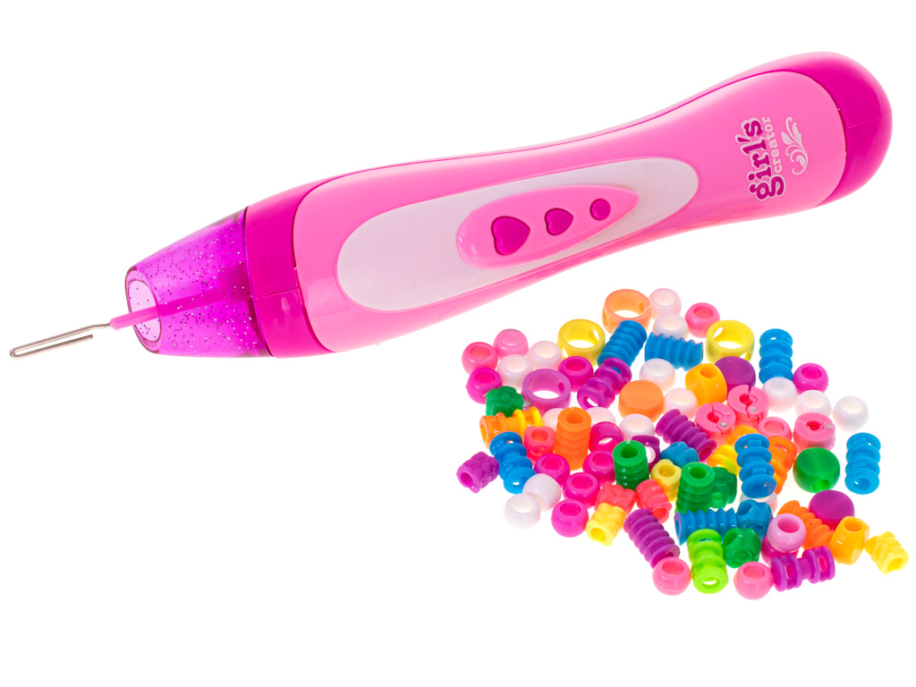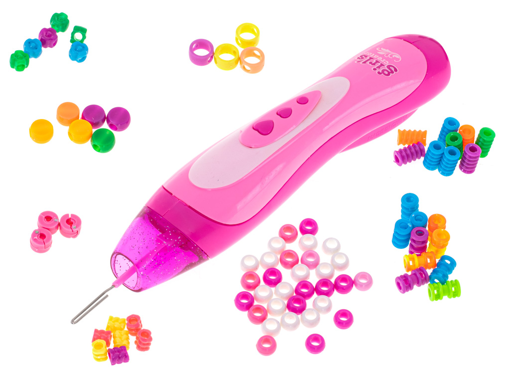 Różowa maszynka do zaplatania koralików we włosach. Umożliwia stworzenie własnej niepowtarzalnej fryzury, dzięki dołączonym kolorowym koralikom. Wyraź siebie poprzez fantazyjną fryzurę! Tworzywo: plastik. Wymiary maszynki: ok.22cm. Ilość koralików: 78szt.