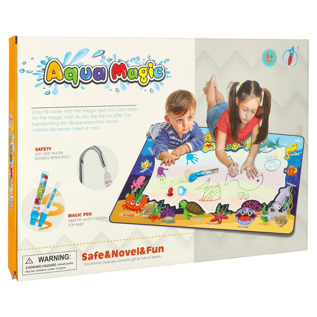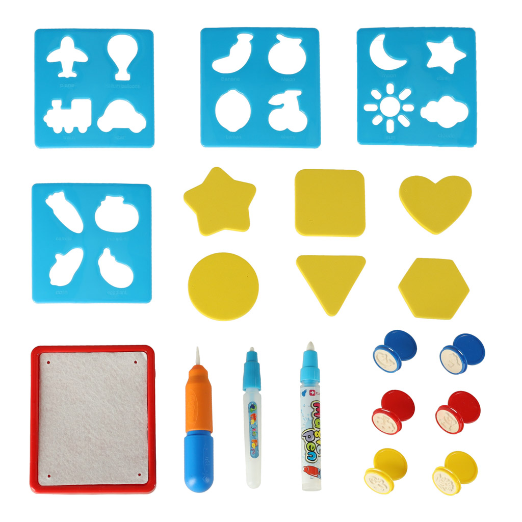 Wielokolorowa mata wodna z akcesoriami. Pobudza wyobraźnię i kreatywność. Mata pozwoli dziecku stać się prawdziwym artystą. Mata po zmoczeniu wodą, odkrywa kolorowy obrazek. W zestawie: mata, 6 stempelków, 2 mazaki, pędzel, 4 szablony. Wym. maty: 100x80cm