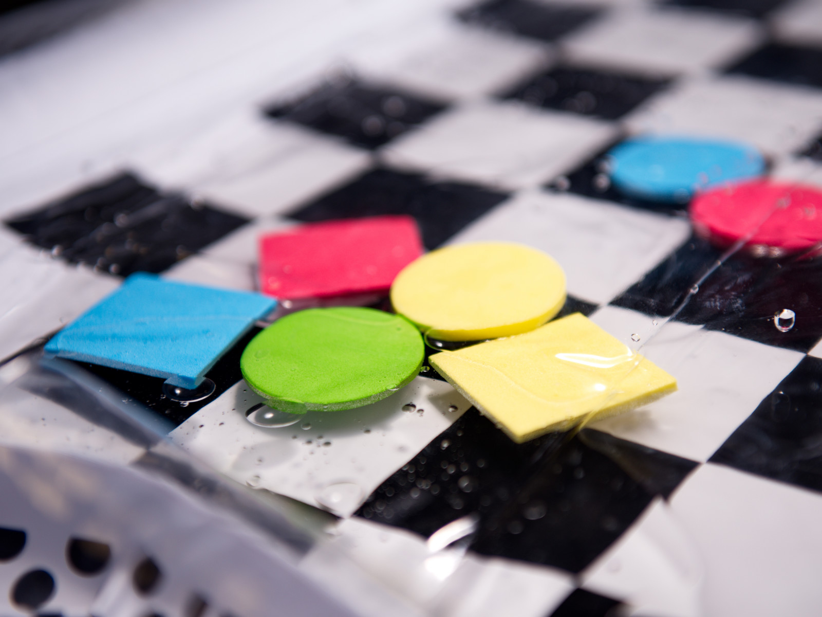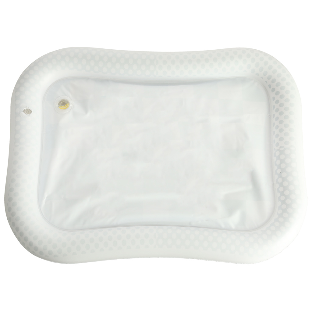 Duża mata wodna, którą można napompować powietrzem lub napełnić wodą. Ozdobiona wzorem szachownicy w kontrastowym odcieniu. Posiada ruchome kolorowe klocki geometryczne. Wykonana z wytrzymałego tworzywa. Kolor: czarno-biały. Wymiary: 65x50cm.