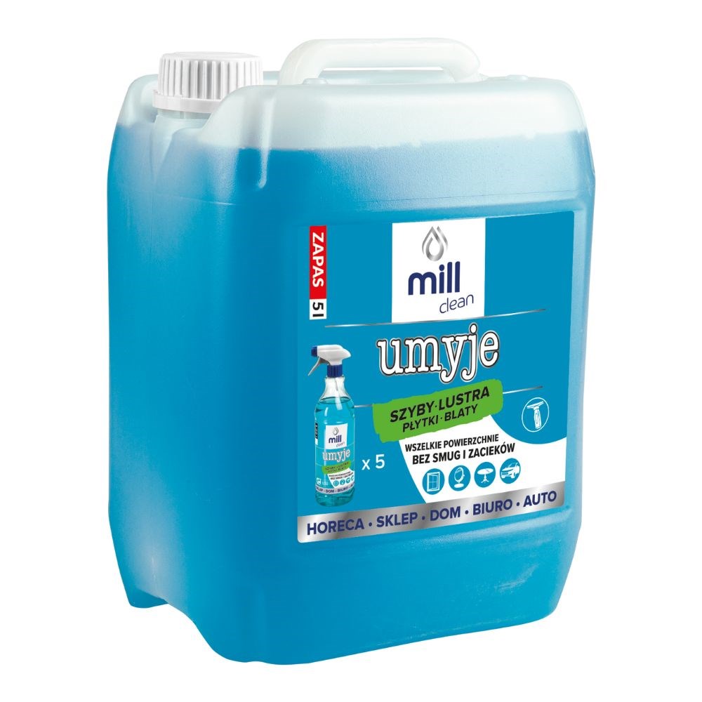 MILL CLEAN UMYJE 5 litrów. Płyn do mycia szyb, luster, glazury, płytek, blatów. Wszelkie powierzchnie bez smug i zacieków. Duży kanister 5 litrów to idealne rozwiązanie dla firm sprzątających, hoteli, biur. (opak.zb 1 szt.)