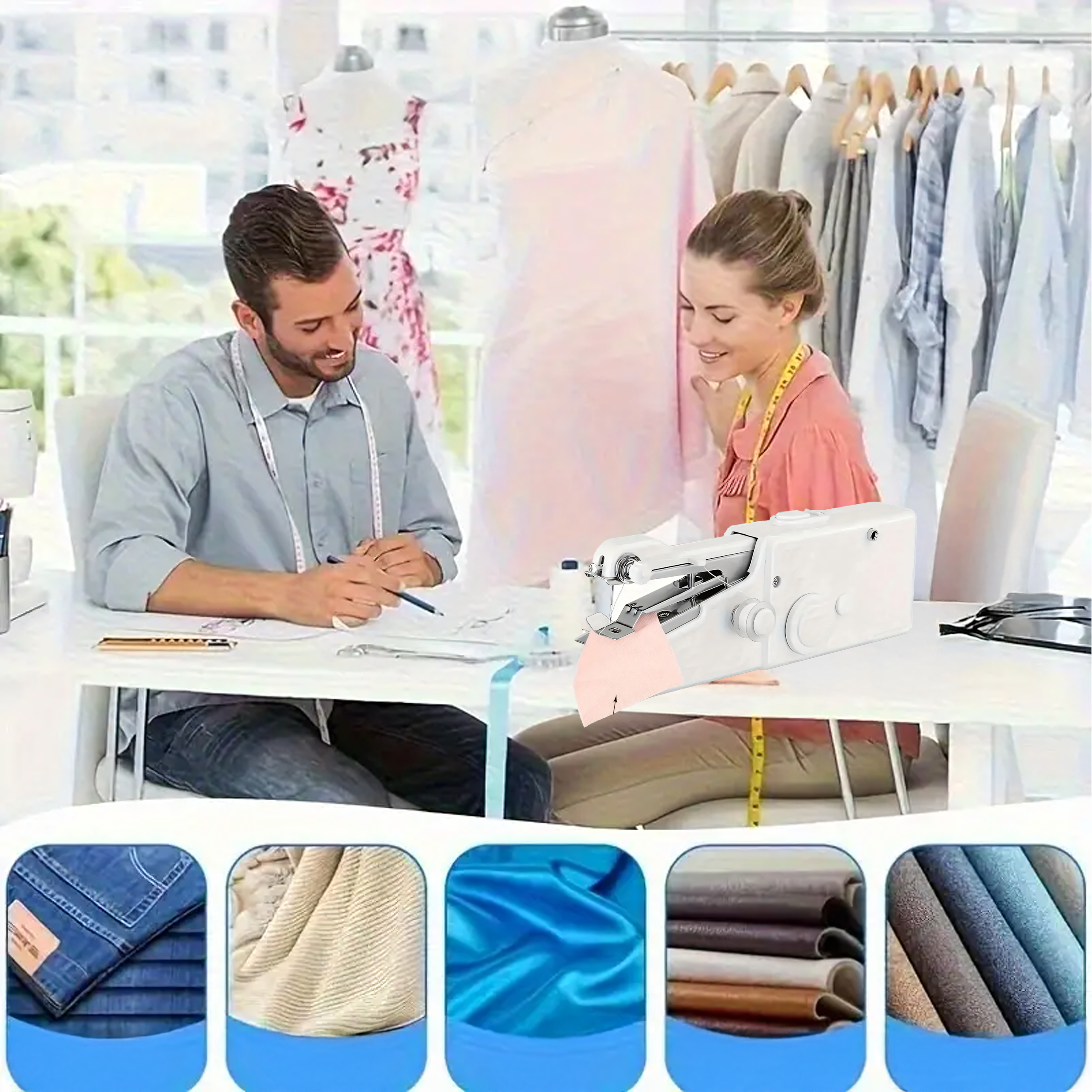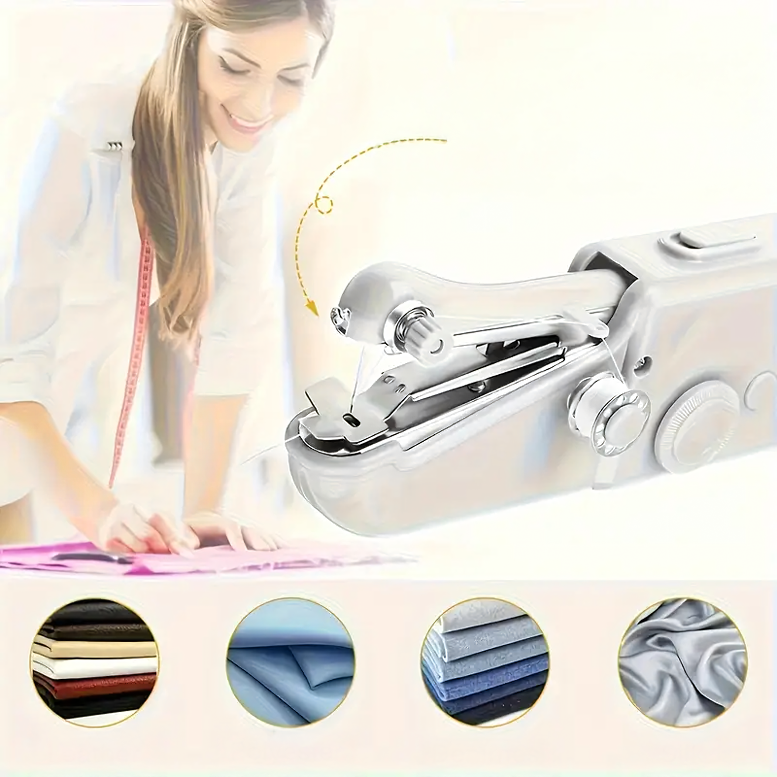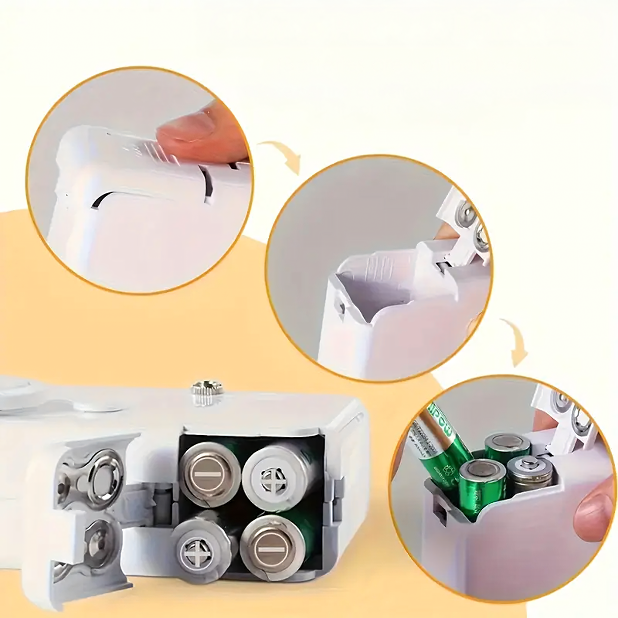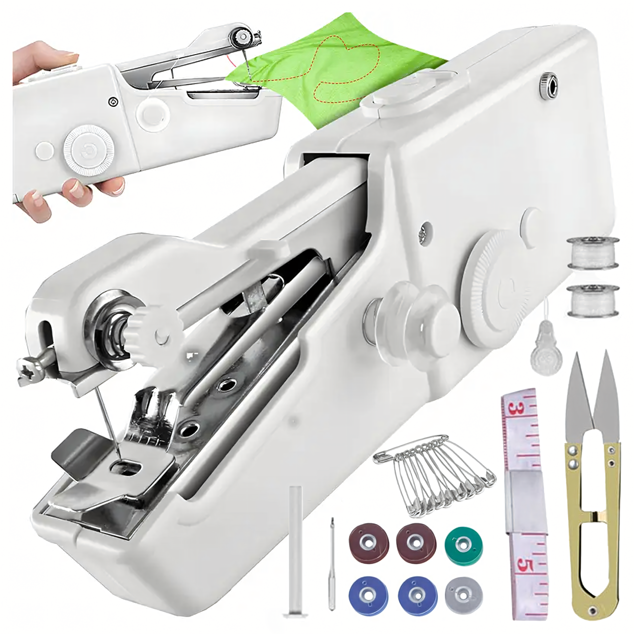 Mini przenośna maszyna do szycia na baterie AA – lekka, kompaktowa i łatwa w obsłudze, idealna do szybkich napraw ubrań w domu i w podróży, radzi sobie z różnymi tkaninami od jedwabiu po jeans, a w zestawie posiada praktyczne akcesoria krawieckie.