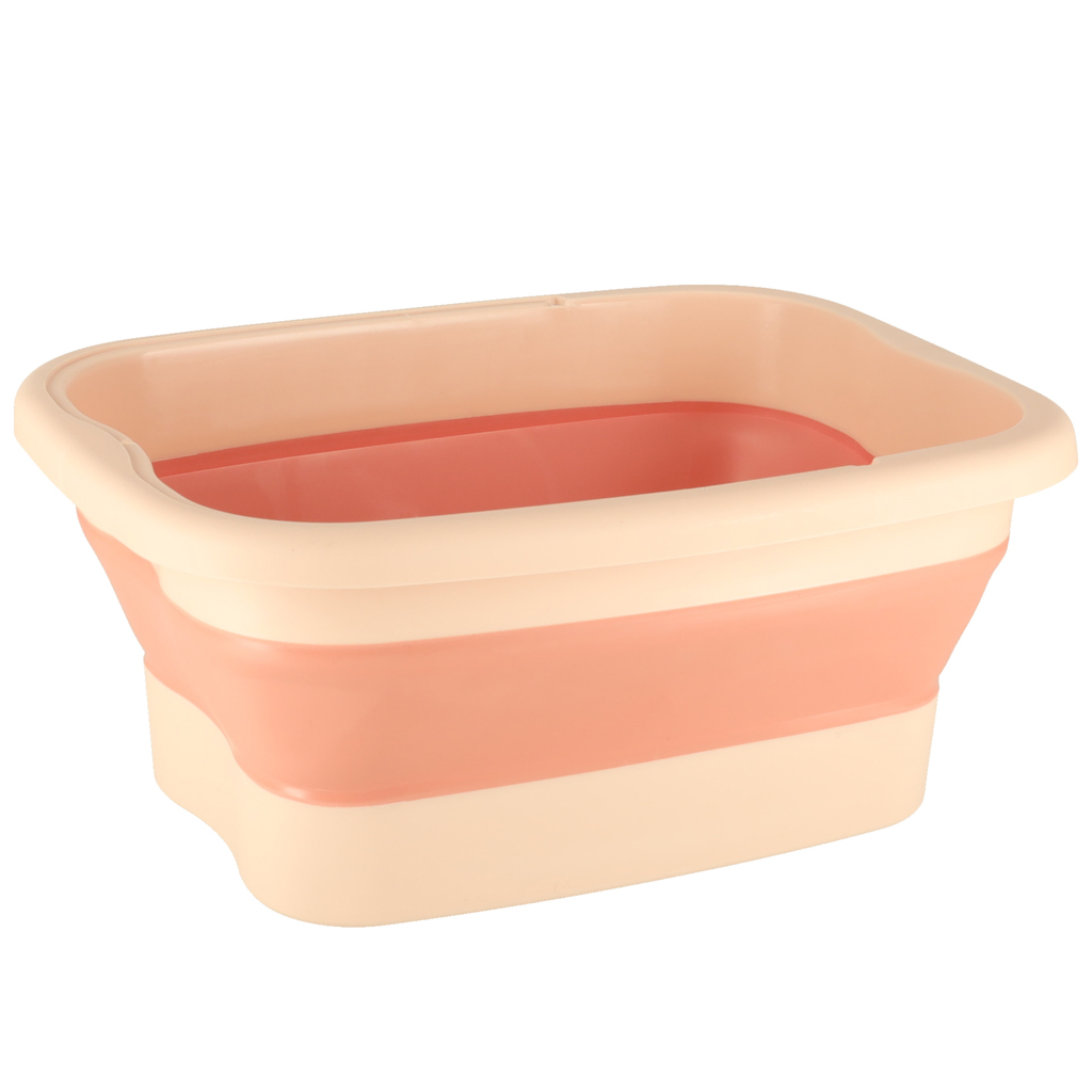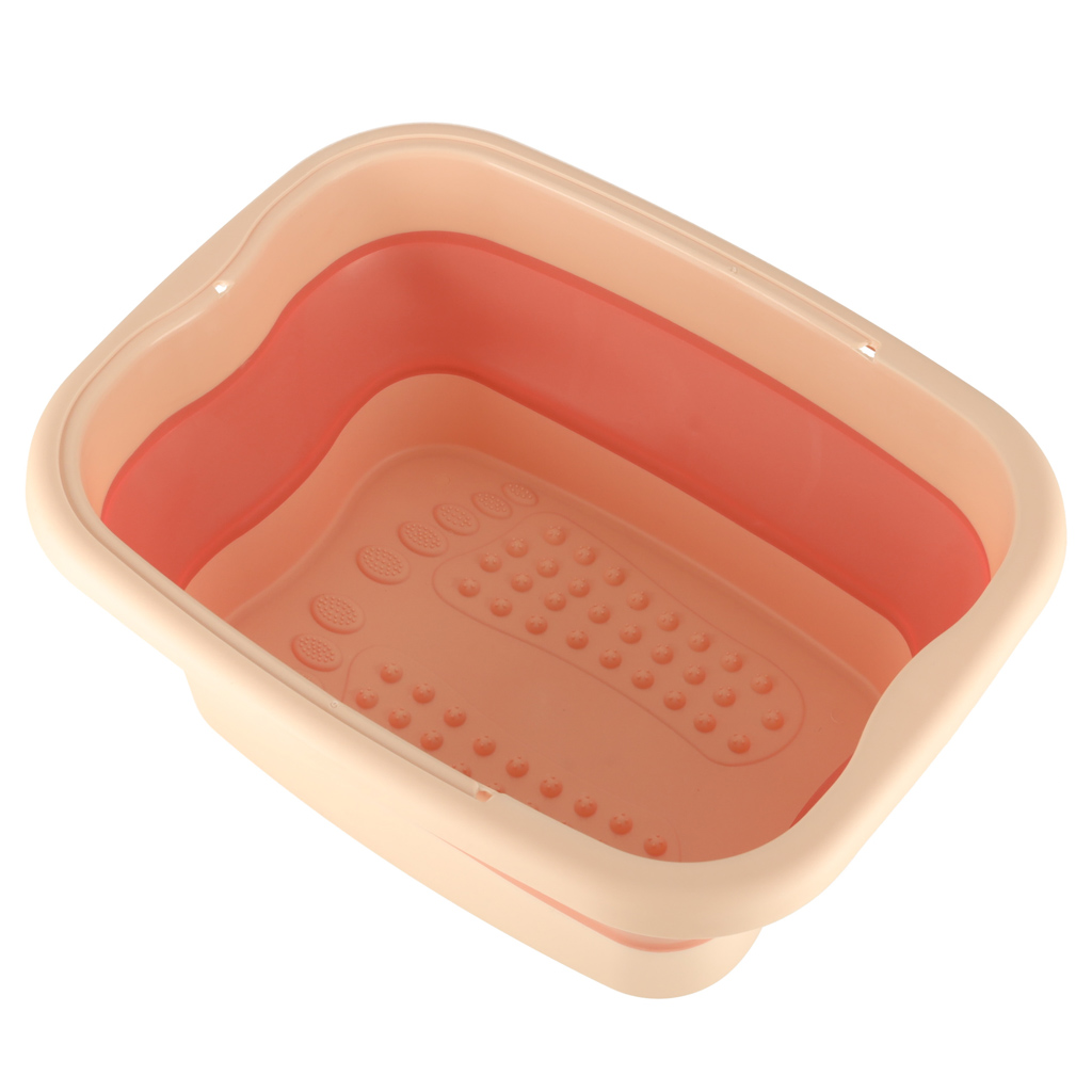 Silikonowa miska do mycia z wypustkami do masażu stóp o wymiarach 40 cm x 18 cm x 31,5 cm. Do zabiegów spa, pedikiuru, akupresury lub do relaksu po pracy. Nakładka z miejscem na nogi pomaga utrzymać stałą temperaturę w misce. Kolor: łososiowy