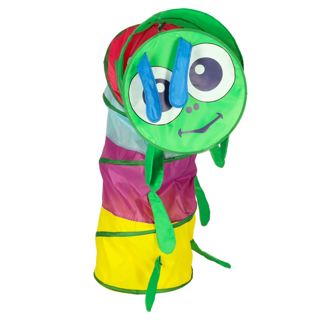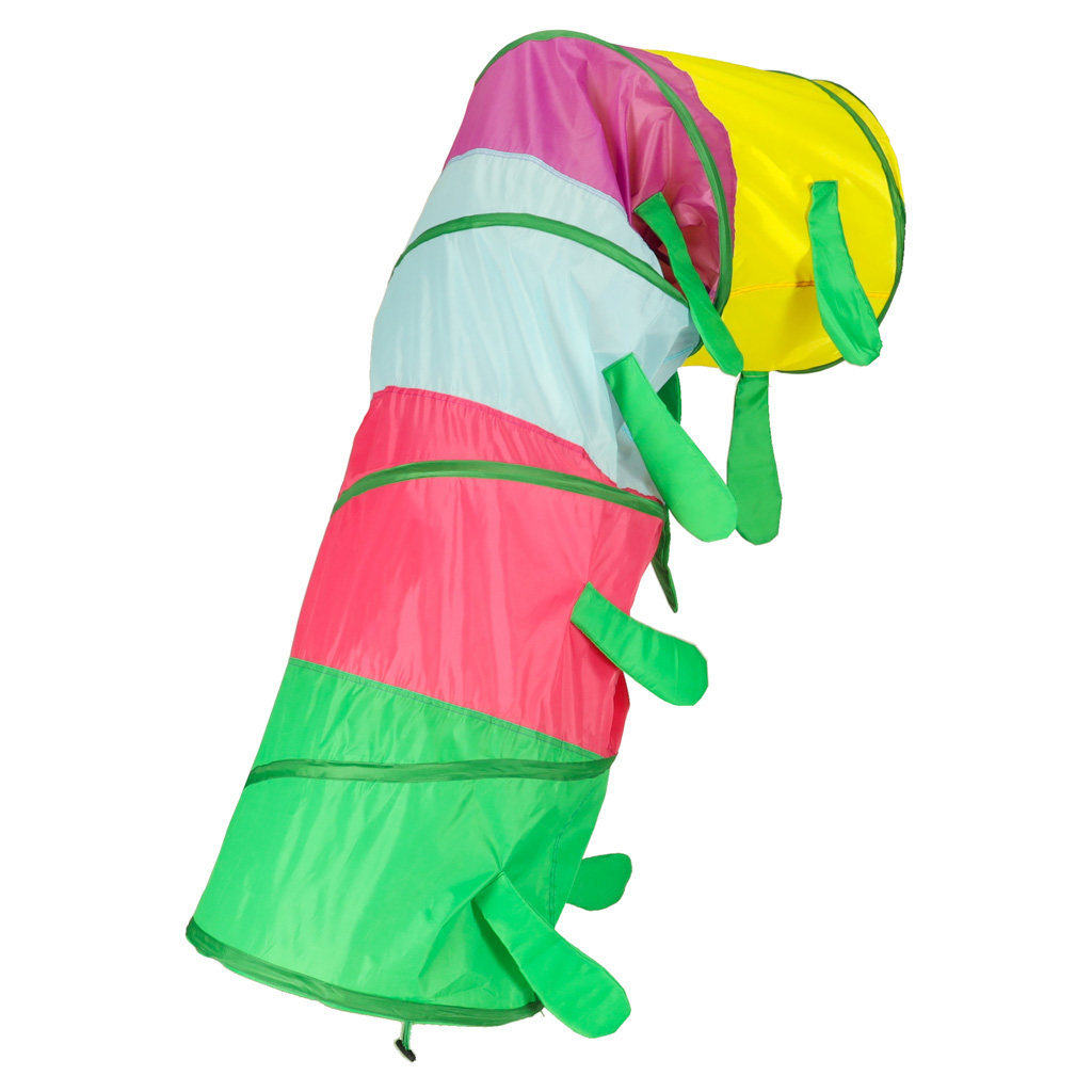 Namiot dla dzieci w kształcie gąsienicy to metoda na rozwój koordynacji ruchowej i motoryki u dziecka powyżej 3. roku życia. Można się nim bawić w domu i na zewnątrz – po złożeniu mieści się w okrągłym pokrowcu. Wymiary: 174 cm x 45 cm, kolor: mix