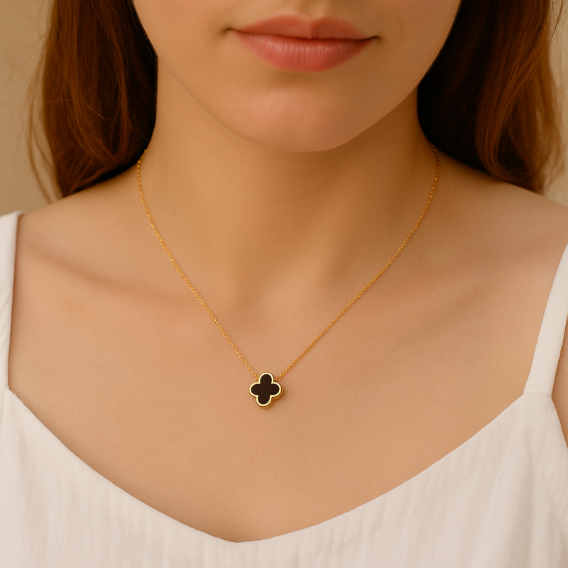 Naszyjnik stal szlachetna pozłacana 14k złotem, czarna koniczynka NST2205