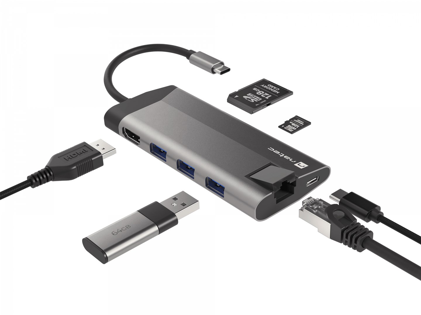 NATEC MULTIPORT ADAPTER FOWLER PLUS USB-C-> USB 3.0 3X, HDMI 4K, USB-C PD, RJ45, MICRO SD NMP-1690