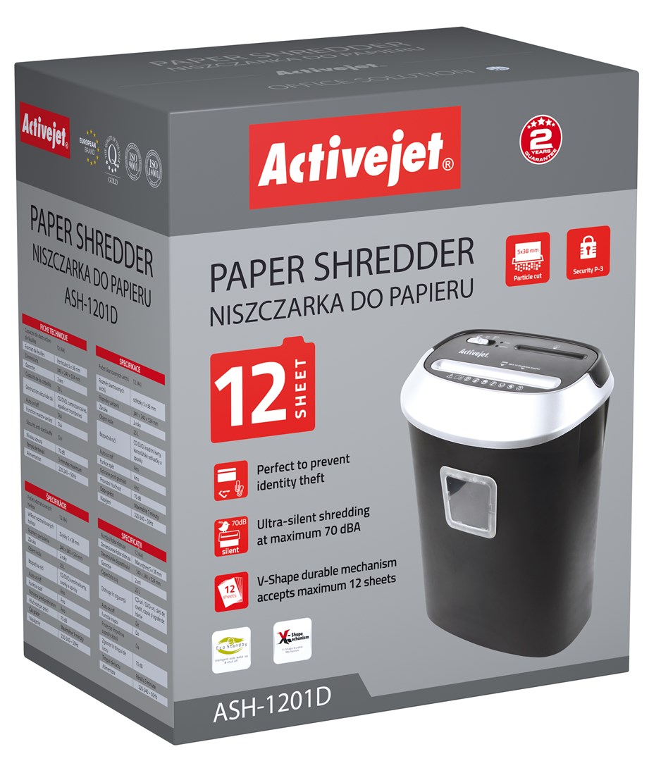 Niszczarka Activejet ASH-1201D, P-3, 25 l, ścinki 5×38 mm, 12 kartek, czarno-srebrna.