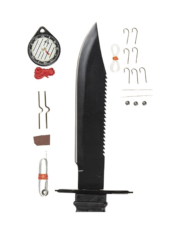 Nóż x 1, Igła x 2, Haczyki wędkarskie x 7, Kompas ze smyczą x 1, Uchwyty do piły ręcznej x 2, Żyłka wędkarska X 1, Zestaw ołowiu wędkarskiego x 3, Piła ręczna x 1