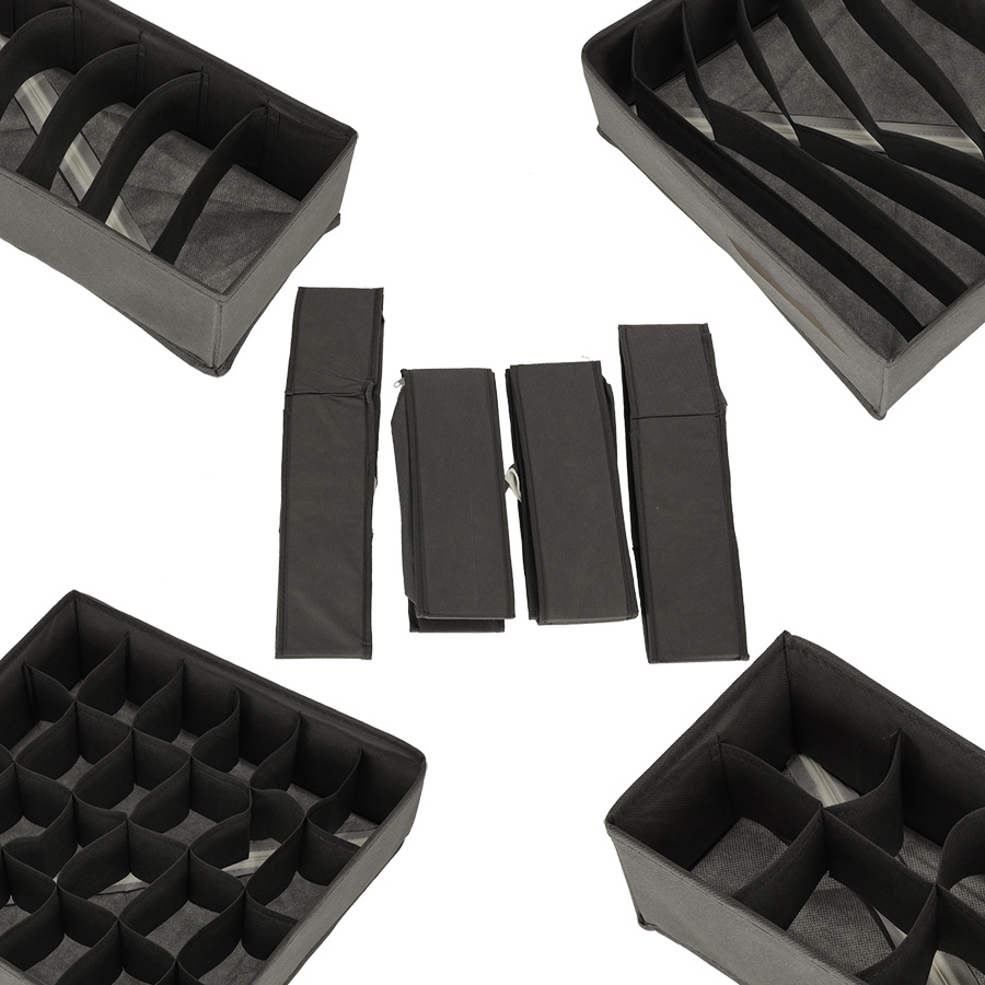 Zestaw czterech praktycznych organizerów na bieliznę. Dzięki nim w szufladach zapanuje porządek. Każdy z pojemników można przeznaczyć na inny typ akcesoriów – skarpety, krawaty, stroje kąpielowe. Kolor: szary. Duży pojemnik: 32 cm x 32 cm x 10 cm.