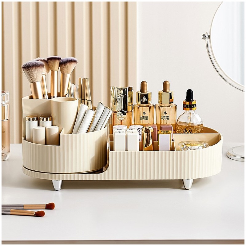 Elegancki ryflowany organizer na kosmetyki z obrotowym pojemnikiem na pędzle. Specyfikacja: Idealne pojemniki do łazienki, garderoby czy sypialni