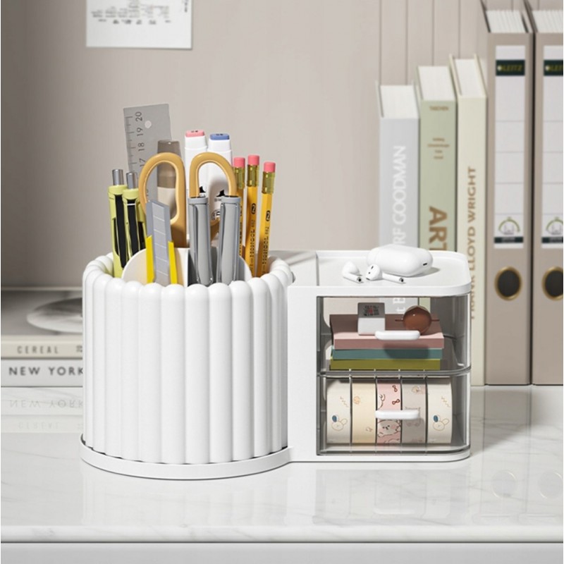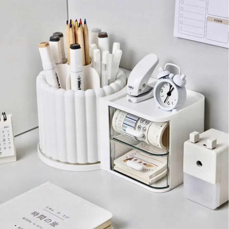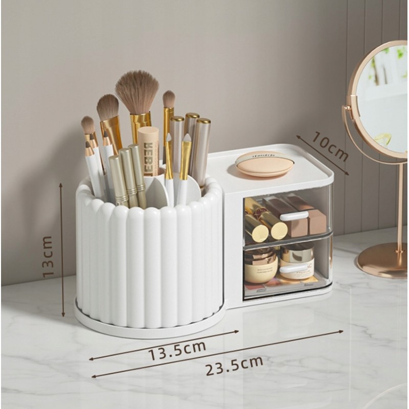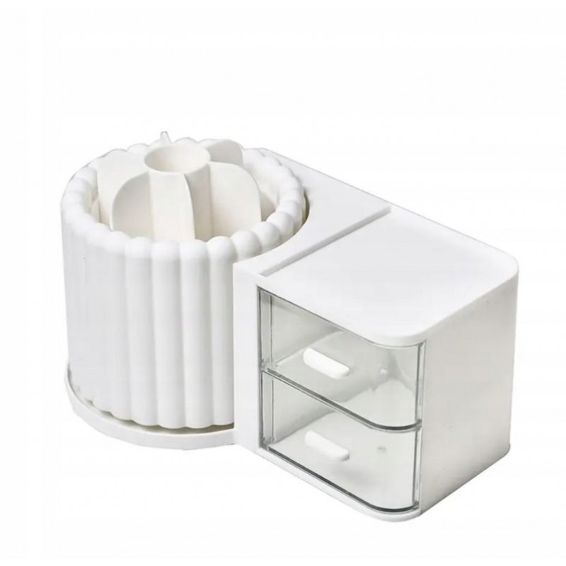 Elegancki ryflowany organizer na przybory, kosmetyki z obrotowym pojemnikiem i dwiema szufladkami. Specyfikacja: Idealny organizer na biurko, do łazienki, garderoby czy sypialni