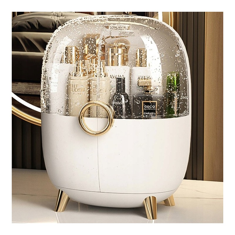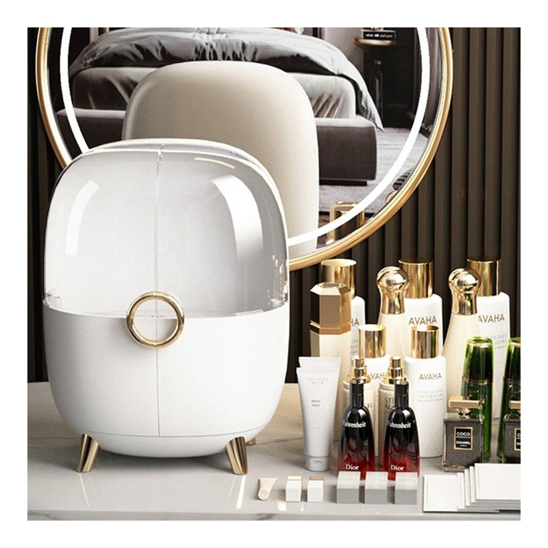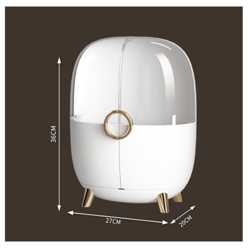 Organizer wykonany został z akrylu w modnym kolorze, dodatkowo elementy w kolorze złotym sprawiają, że produkt prezentuje się ekskluzywnie. Przeźroczyste wieko pozwala z łatwością odnaleźć potrzebny kosmetyk. Cechy produktu:
