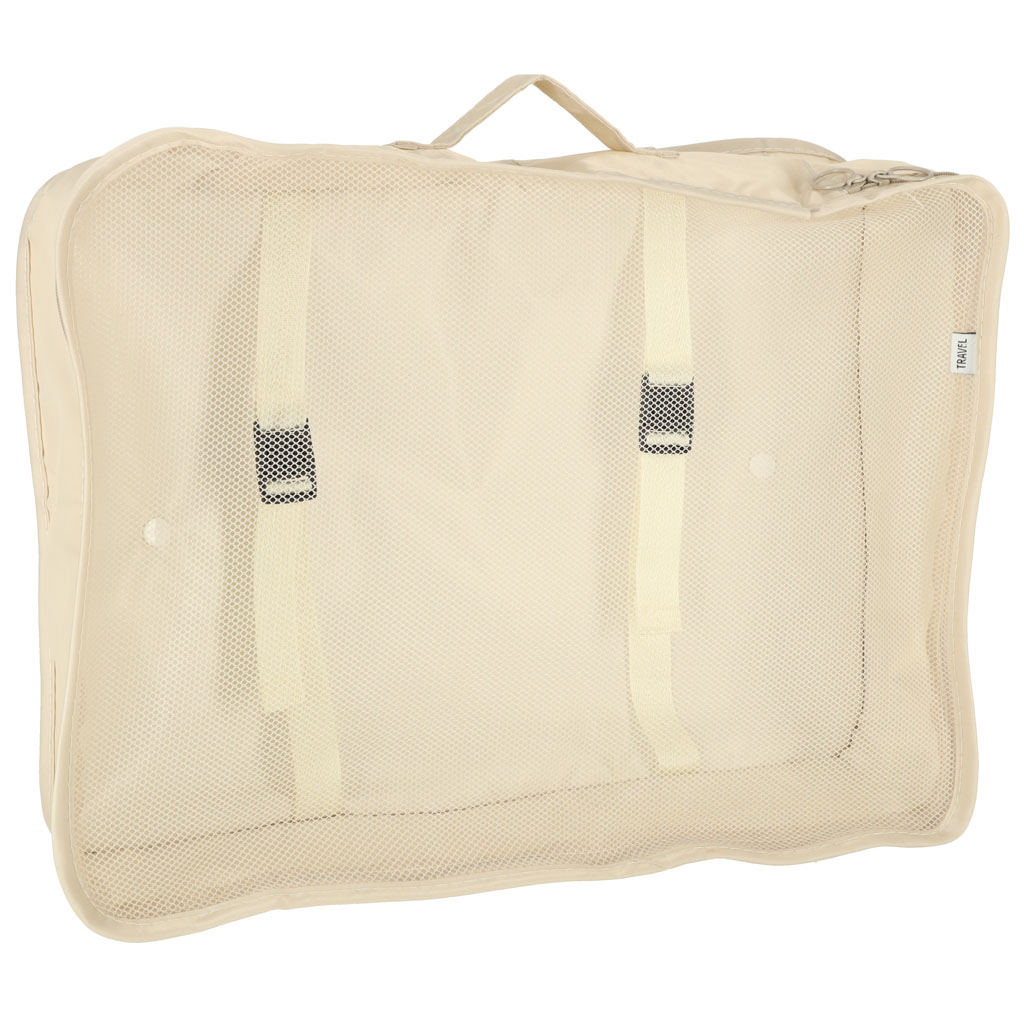 Beżowe organizery do walizki 8 sztuk. Ułatwiające zachowanie porządku w bagażu. Doskonałe na podróż, jak i do używania w domu. Tworzywo: poliester. Wym. Największego organizera: 40 cm x 30 cm x 10,5 cm.