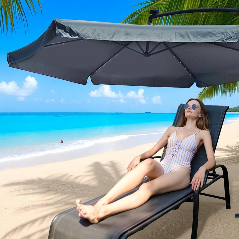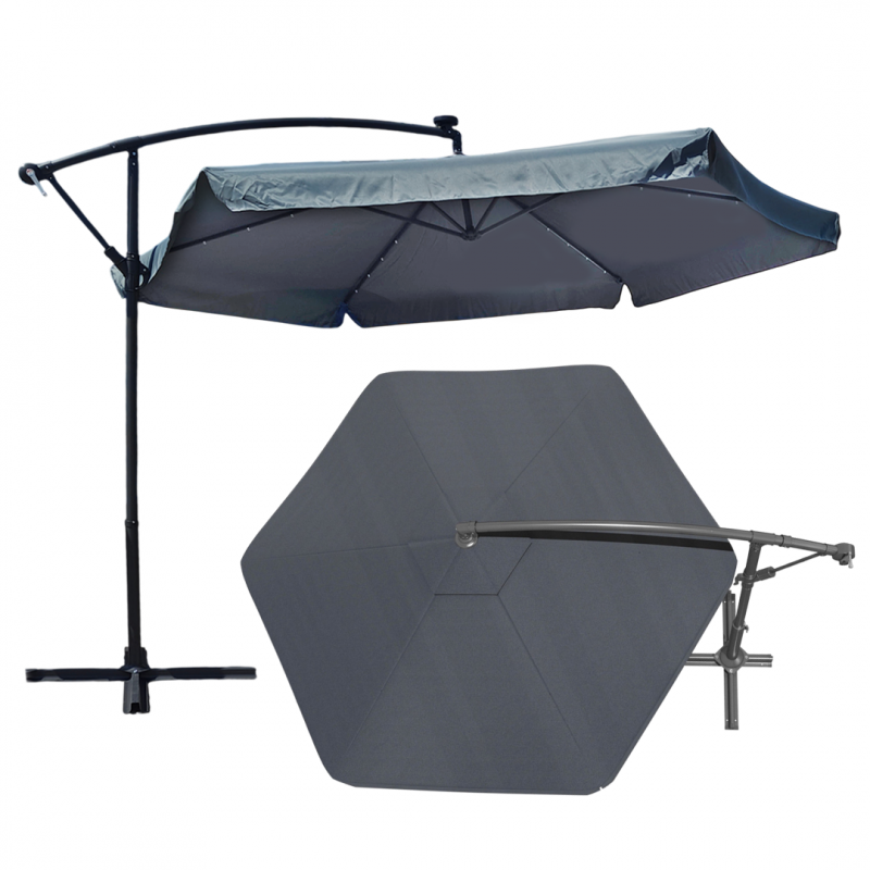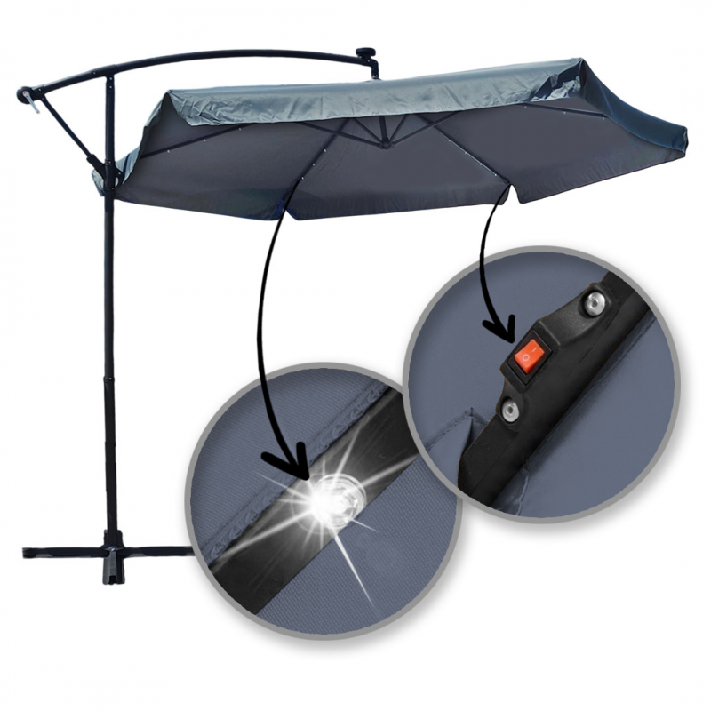 Parasol ogrodowy z wysięgnikiem + lampki SOLAR LEDParasol ogrodowy to idealny wybór dla osób poszukujących niezawodnej ochrony przed słońcem!Zaprojektowany z myślą o maksymalnej funkcjonalności i wygodzie. Zapewnia nie tylko cień, ale i ochronę przed szkodliwym promieniowaniem UV. Specyfikacja:- Poszycie parasola zapewnia odporność na m.in. przed wiatrem, deszczem i słońcem (filtr UV50+). Materiał jest wodoodporny.- Parasol posiada bardzo nowoczesny system regulacji wysokości i kąta nachylenia czaszy. – Solidny stelaż oraz 8 mocnych żeberek. Jakościowe wykonanie sprawia, że parasol znakomicie sprawdza się nawet przy niekorzystnych warunkach pogodowych.- Produkt jest składany, sposób rozkładania: korba.- Wbudowane lampki SOLAR LEDOświetlenie parasola zasilane jest energią słoneczną dzięki dołączonemu zasilaczowi solarnemu.Dzięki temu parasol nie wymaga podłączenia do sieci elektrycznej.Materiał:- Materiał poszycia: 100% poliester, gramatura 180 gr/m2- Materiał stelaża: stalBudowa:- 6 stalowych żeberek 12 x 18mm- Stalowa kolumna 48 mm- Podstawa: krzyżowaWymiary i waga:- Średnica czaszy: 300 cm- Wysokość: 262 cm- Szkielet: żeberka: 12×18 mm, kolumna o średnicy 48 mmWaga: 15 kgWymiary opakowania:198cm x 32cm x 15cm