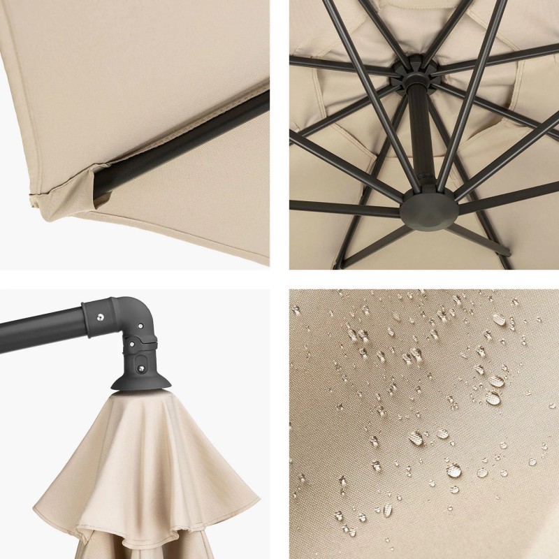 – Poszycie parasola zapewnia odporność na m.in. przed wiatrem, deszczem i słońcem (filtr UV50+). Materiał jest wodoodporny.