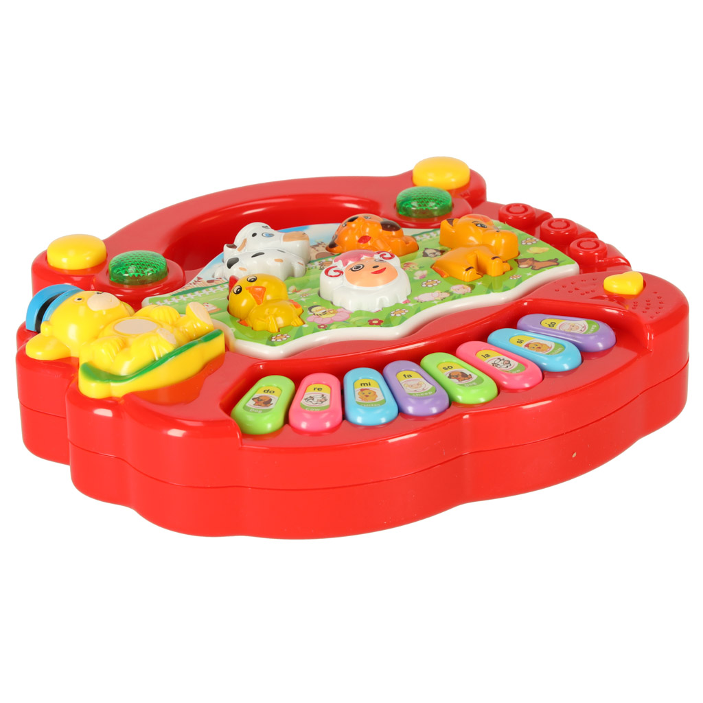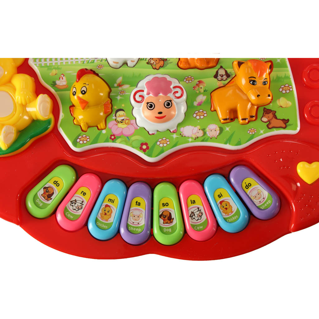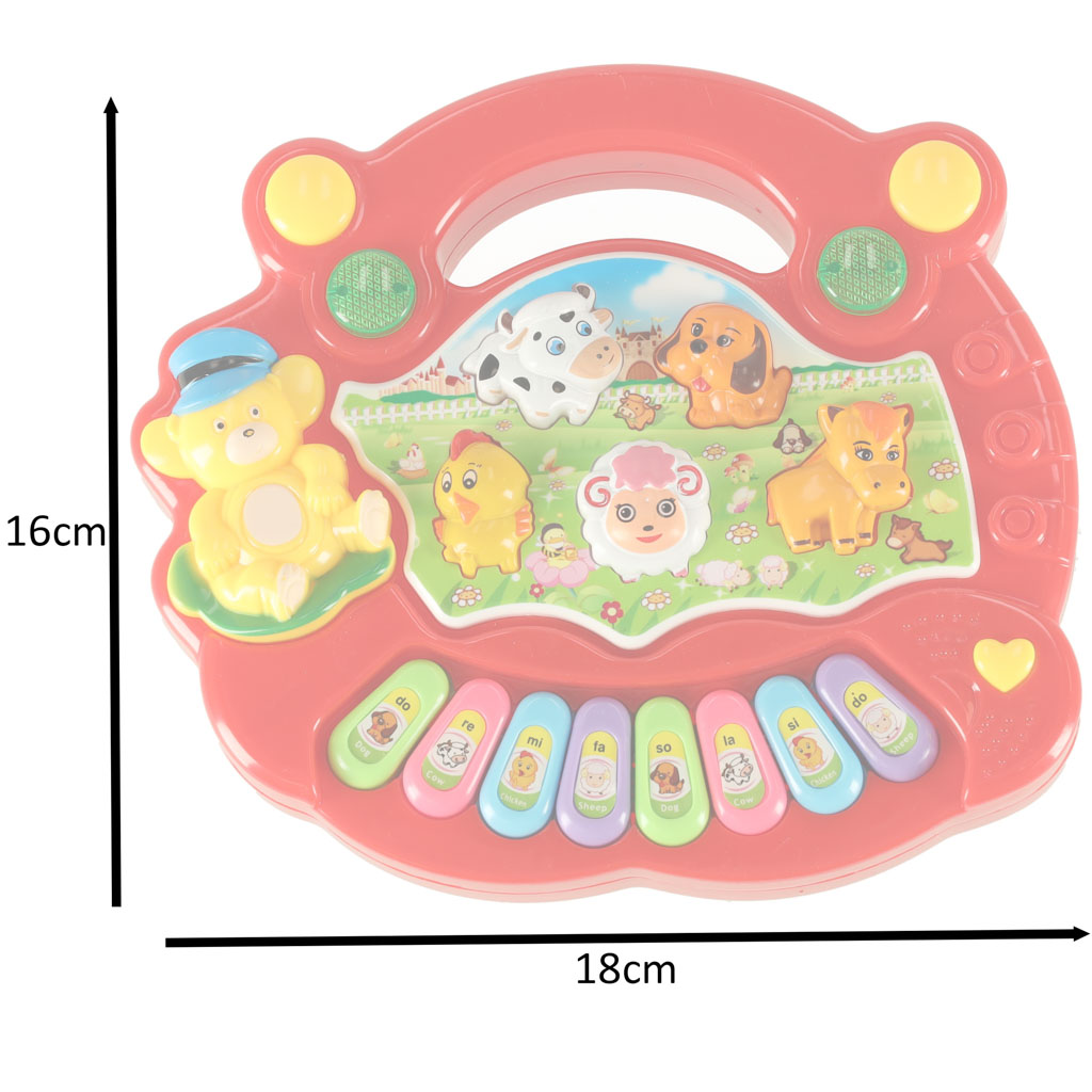 Pianinko edukacyjne z odgłosami zwierząr farmy.Pianinko wykonane z plastiku. Żywe kolory i efekty świetlne, dźwiękowe przyciągną uwagę malucha. Dostępne w kolorze czerwonym. Zasilane 3 bateriami AA1,5V- brak w zestawie.Wymiary 18x16x35cm