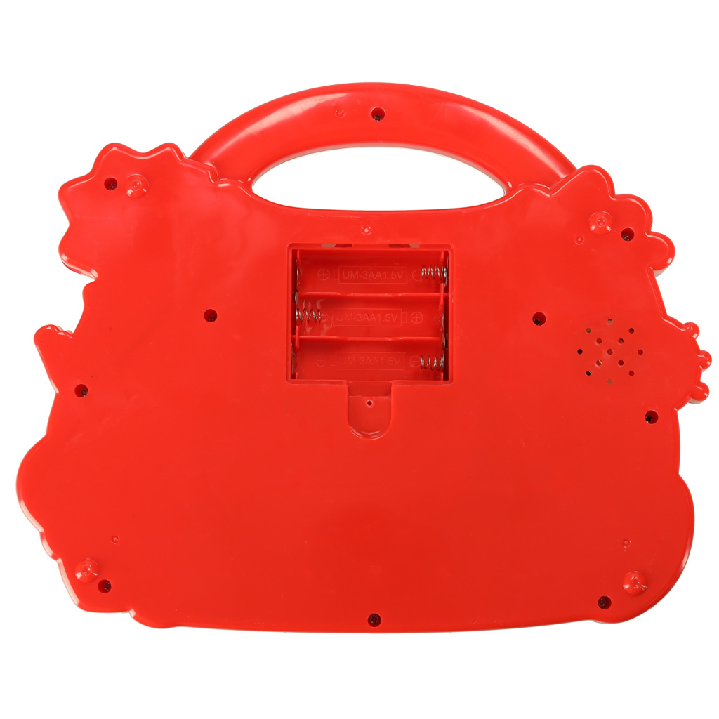 Zabawka uczy liczb, literek i nazw zwierzątek w języku angielskim. Po naciśnięciu przycisków słyszalne są odgłosy zwierzątek. Zasilanie: 3 baterie AA. Wymiary: 25x20x4cm.