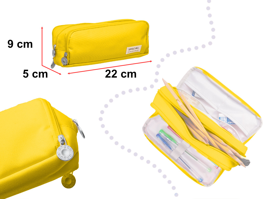Rewelacyjny piórnik saszetka potrójna. Świetnie sprawdzi się również w roli kosmetyczki. Pojemna saszetka pomieści wszelkie niezbędne przedmioty. Ilość przegród: 3 zapinane na zamki błyskawiczne. Kolor: żółty. Tworzywo: poliester. Wym. piórnika: 22x5x9cm.