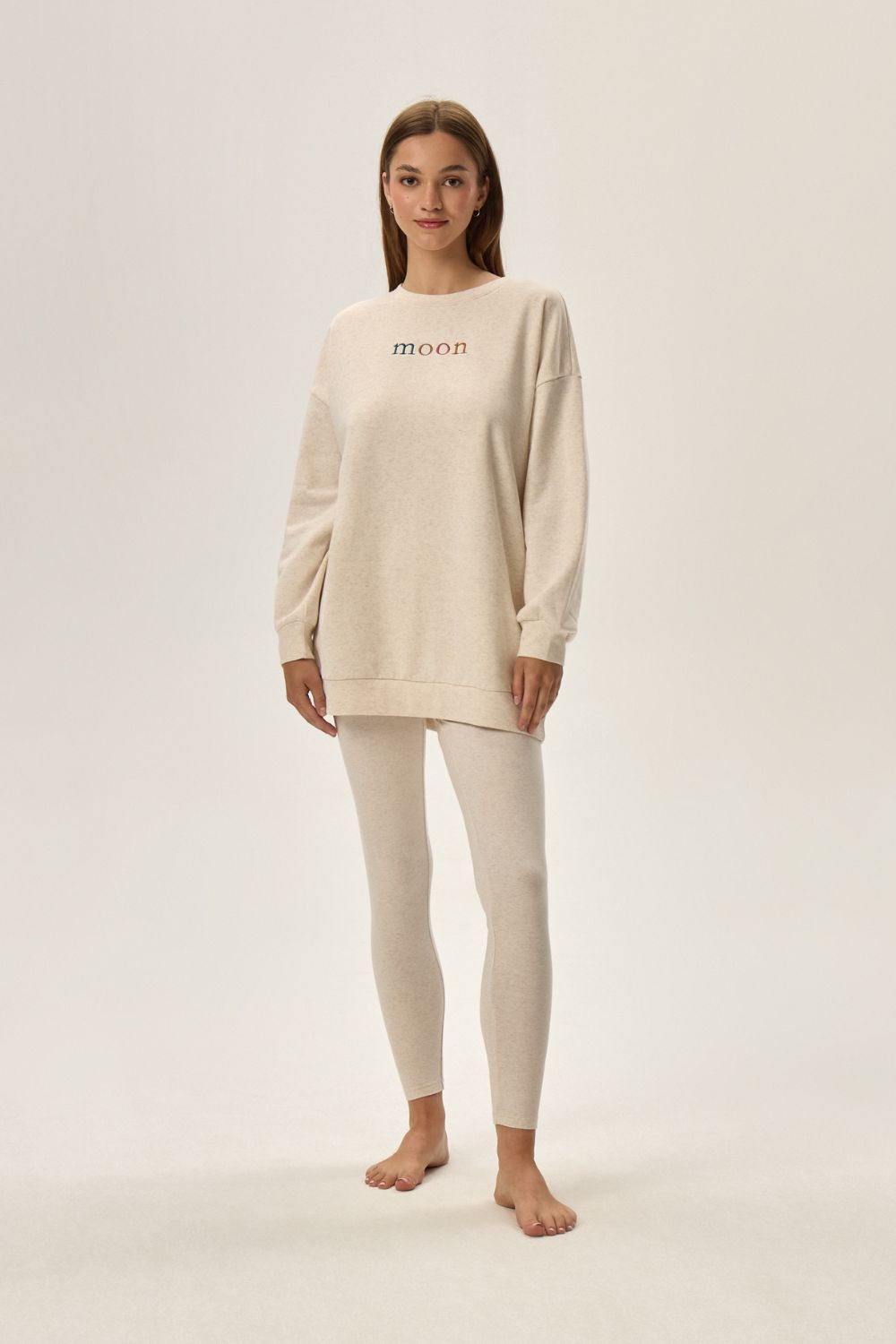 Komplet Fune to dwuczęściowy zestaw uszyty z przyjemnej w dotyku dzianiny. Składa się z luźnej góry z napisem i długim rękawem oraz legginsów sięgających do kostek. Legginsy posiadają szeroką gumę w pasie. Damska odzież domowa w kolorze beżowym przypadnie Ci do gustu, jeśli jesteś miłośniczką wygodnych ubrań w jasnej, neutralnej kolorystyce.