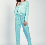 Komfortowa piżama damska o luźnym kroju, zaprojektowana z myślą o spokojnym śnie i relaksie. Górna część z rękawem 3/4 i klasycznym, okrągłym dekoltem zapewnia swobodę ruchów i wygodę noszenia. Długie spodnie ozdobione modnym nadrukiem posiadają elastyczną gumkę w pasie oraz troczki do regulacji obwodu, co pozwala idealnie dopasować je do sylwetki. Brak kieszeni i przemyślany fason sprawiają, że piżama prezentuje się lekko i estetycznie. Całość pakowana w praktyczny woreczek foliowy, idealna na prezent lub jako wygodny zestaw na każdą noc.