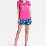 Ta damska piżama to idealny wybór dla kobiet szukających połączenia wygody i subtelnego stylu. Bluzka z krótkim rękawem i okrągłym dekoltem, ozdobiona modnym nadrukiem, ma luźny, komfortowy krój, który zapewnia pełną swobodę ruchów. Wykonana z miękkiej i przewiewnej tkaniny, doskonale sprawdzi się podczas każdej pory roku. Spodnie z nadrukiem, o długości pełnej, bez kieszeni, są wygodne i stylowe. Szeroka guma w pasie gwarantuje doskonałe dopasowanie i komfort noszenia przez całą noc. Stonowana kolorystyka piżamy dodaje jej eleganckiego i ponadczasowego charakteru. To idealna piżama na spokojny sen, która zapewni wygodę i modny wygląd w domowym zaciszu.