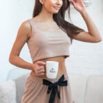 Co zarzucić na siebie gdy w mieszkaniu ciepło, a za oknem piękna pogoda? Spójrz na zestaw Lucia, od Sensis. W zestawie sexy top na szerszych ramiączkach oraz kokieteryjne szorty na gumce z czarnym troczkiem w pasie, który zawiązać możesz na słodką kokardę. Kolor beżowy (cappuccino), tkanina miękka, prążkowana, bardzo ciekawa.