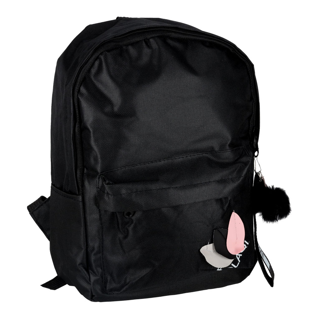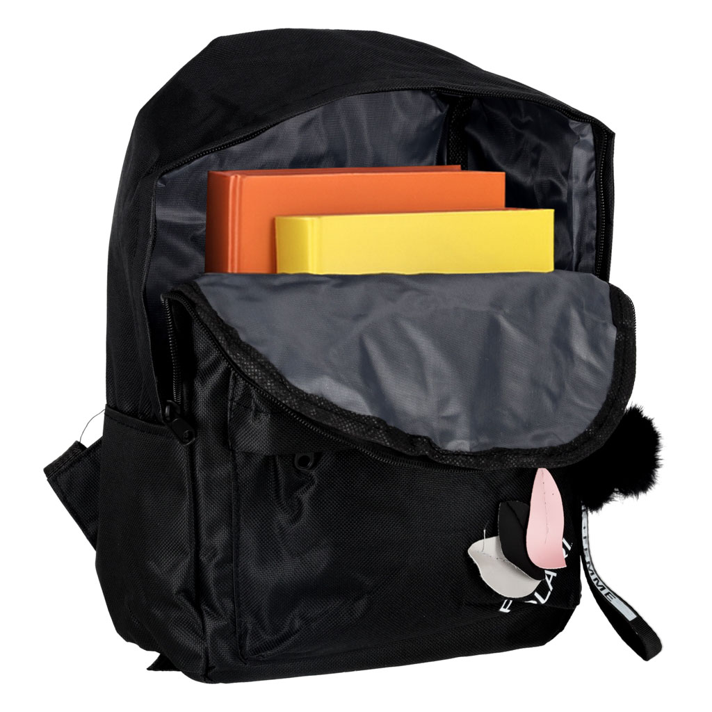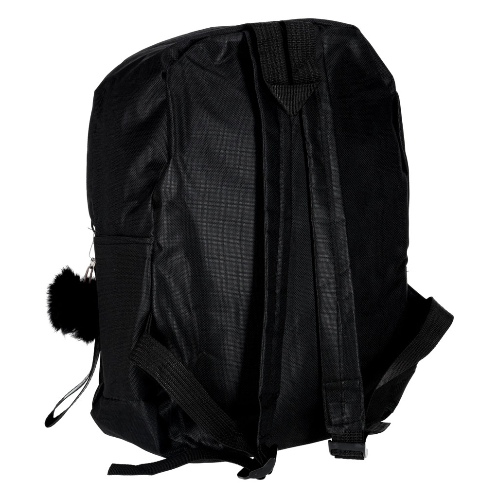 Czarny plecak szkolny o wymiarach 35 cm x 10,5 cm x 25 cm jest przeznaczony dla dzieci i młodzieży chodzącej do szkoły podstawowej. Do zestawu dołączony jest breloczek z taśmą i pomponem, który służy za ozdobę plecaka.