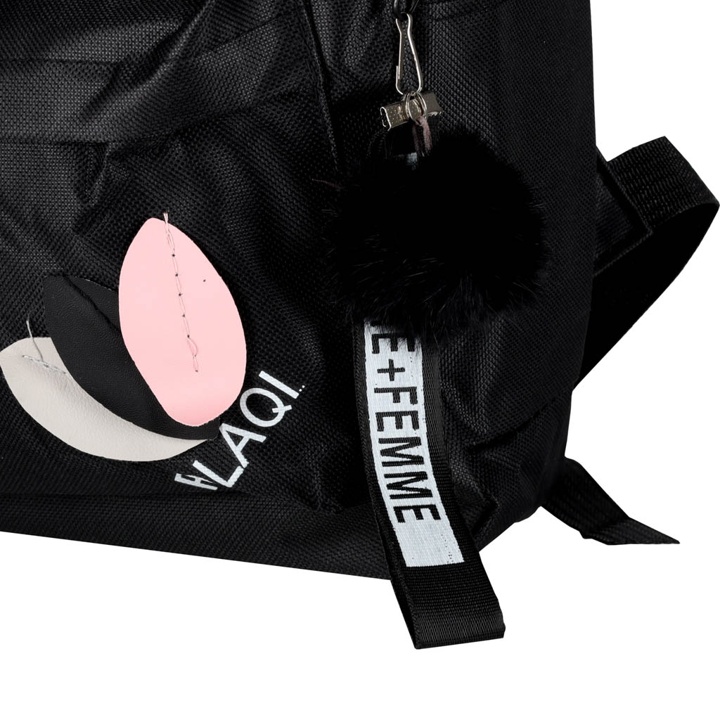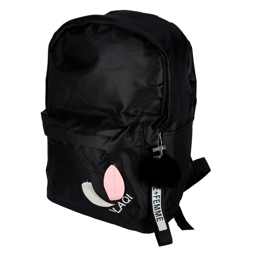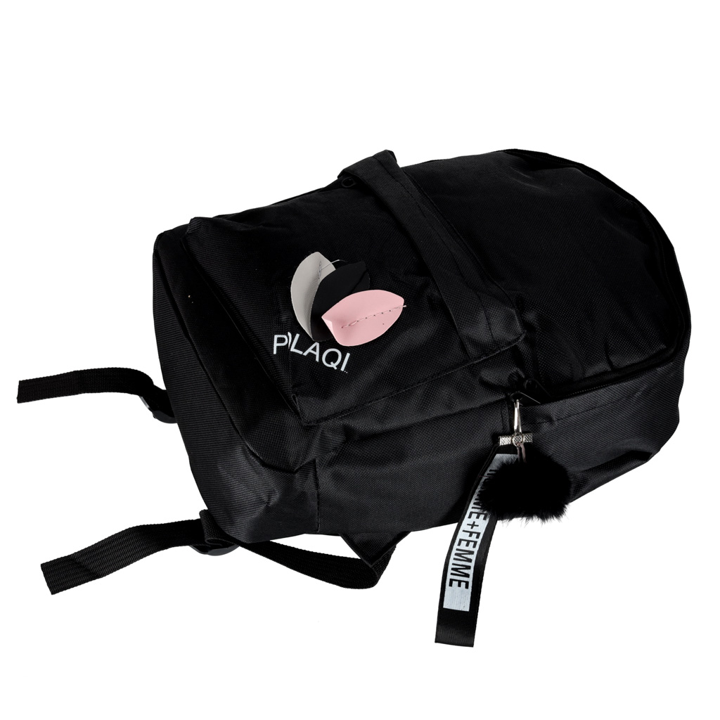 Czarny plecak szkolny o wymiarach 35 cm x 10,5 cm x 25 cm jest przeznaczony dla dzieci i młodzieży chodzącej do szkoły podstawowej. Do zestawu dołączony jest breloczek z taśmą i pomponem, który służy za ozdobę plecaka.