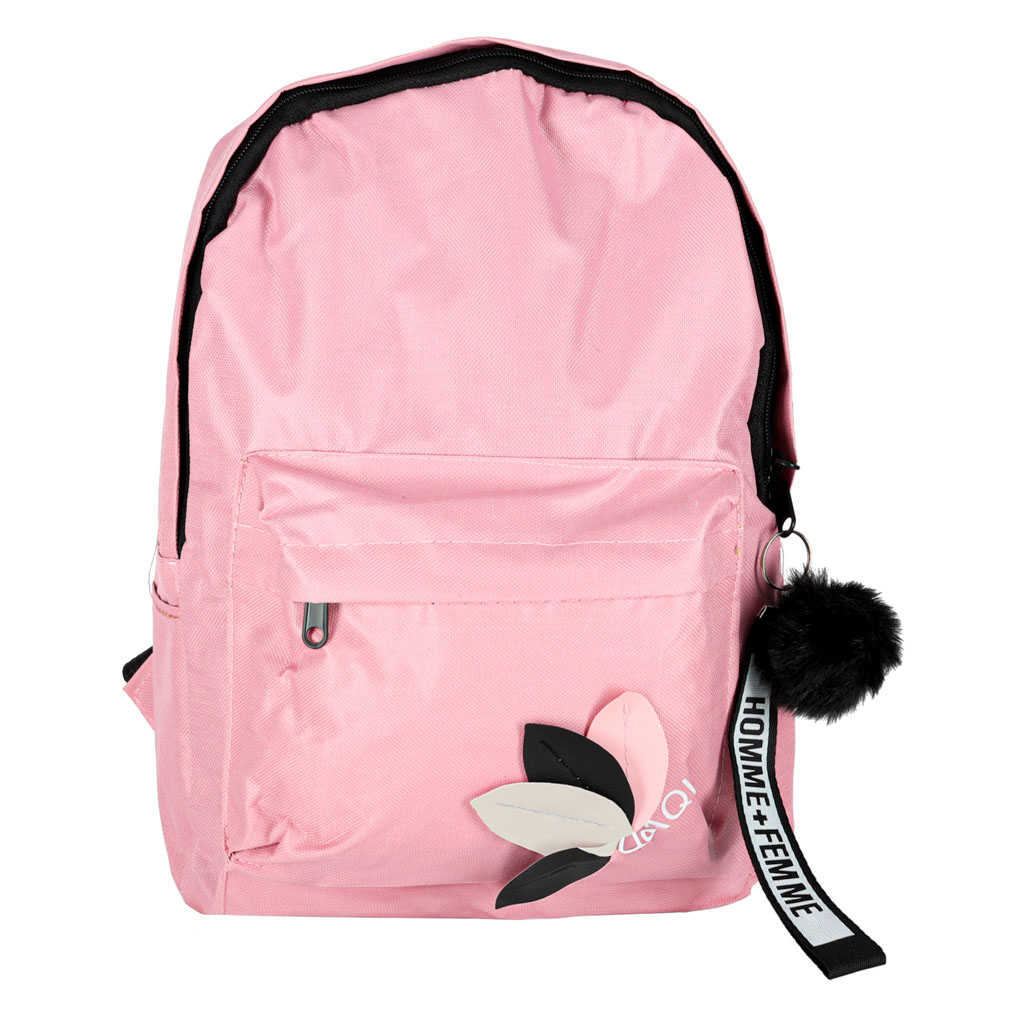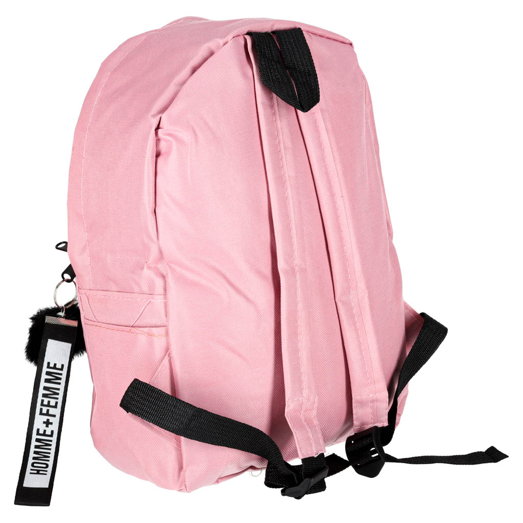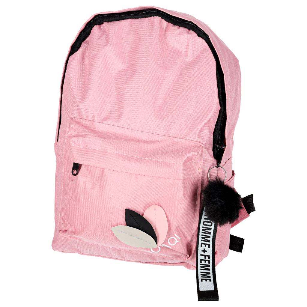 Różowy minimalistyczny plecak szkolny dla dzieci i młodzieży z breloczkiem. Ma wymiary 35 cm x 10,5 cm x 25 cm i jest wykonany z poliestrowej tkaniny Oxford. Odpowiedni dla dzieci i młodzieży chodzących do szkoły podstawowej.