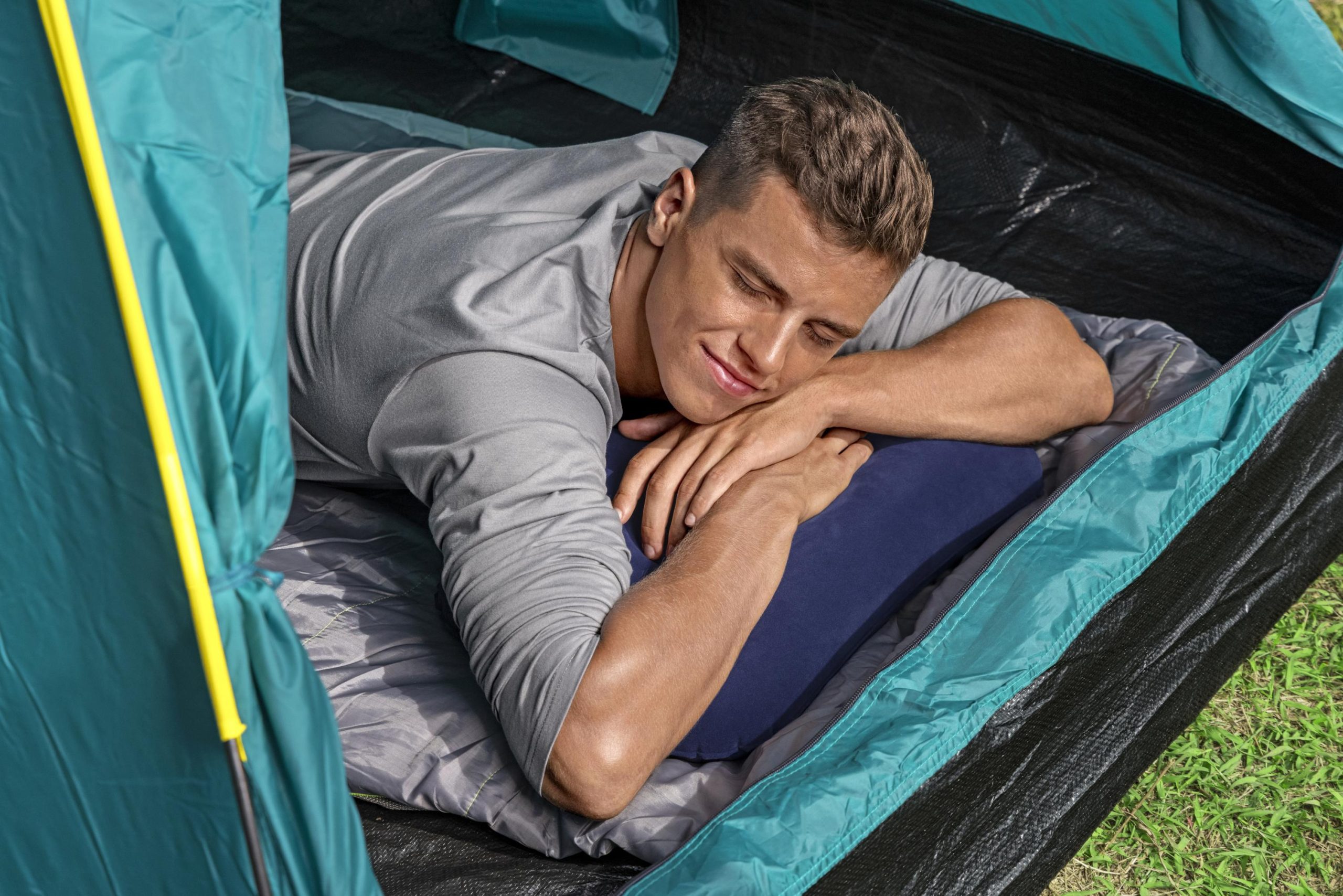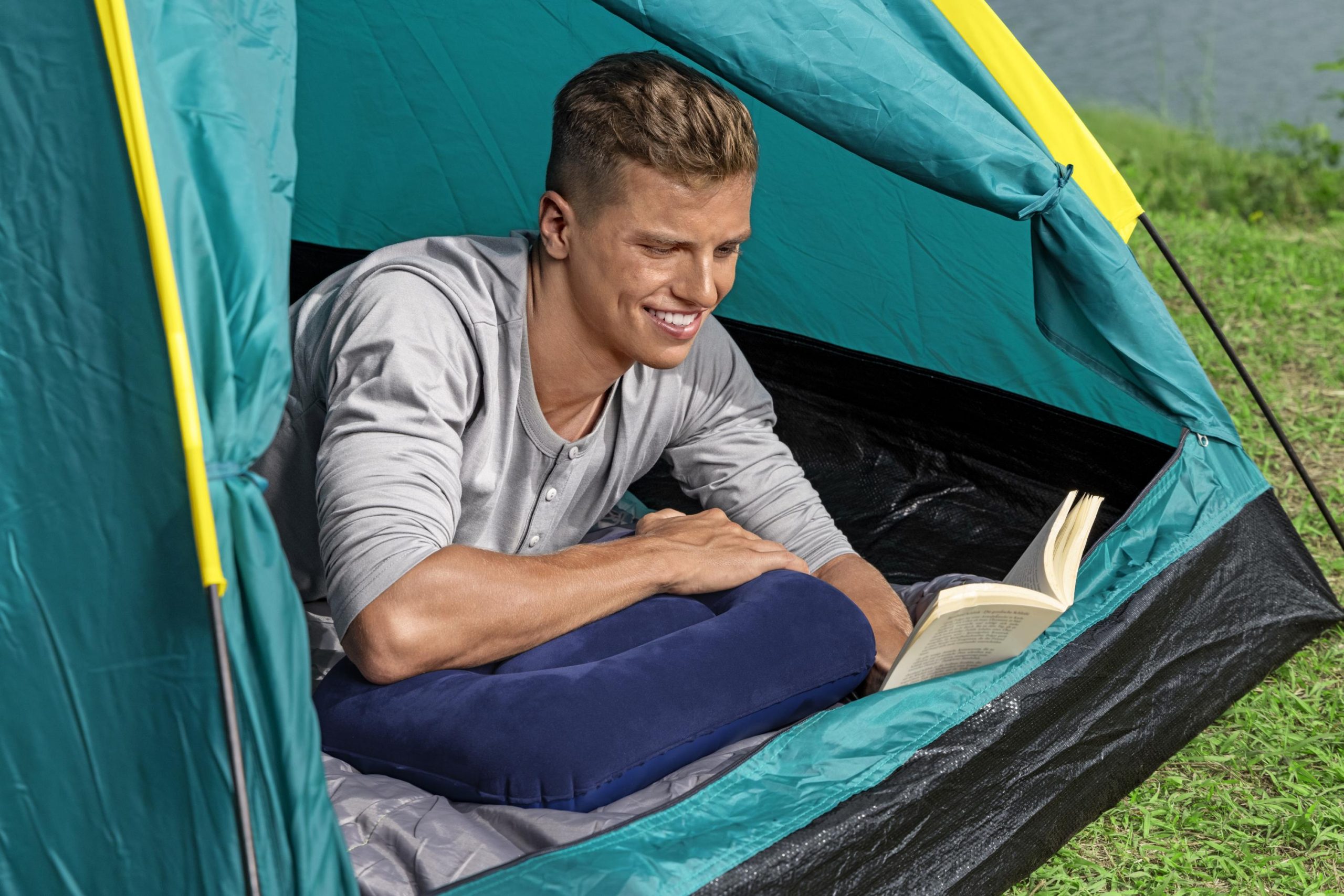 Wygodna dmuchana poduszka, która przyda się podczas każdej nocy na kempingu czy podczas całodniowego opalania się na plaży. Pokryta jest welurowym poszyciem, aby odpoczynek był jeszcze bardziej przyjemny. Kolor: granatowy. Wymiary: 42 x 26 x 10 cm.
