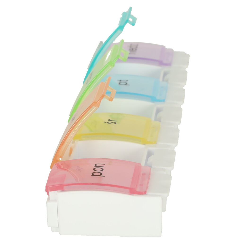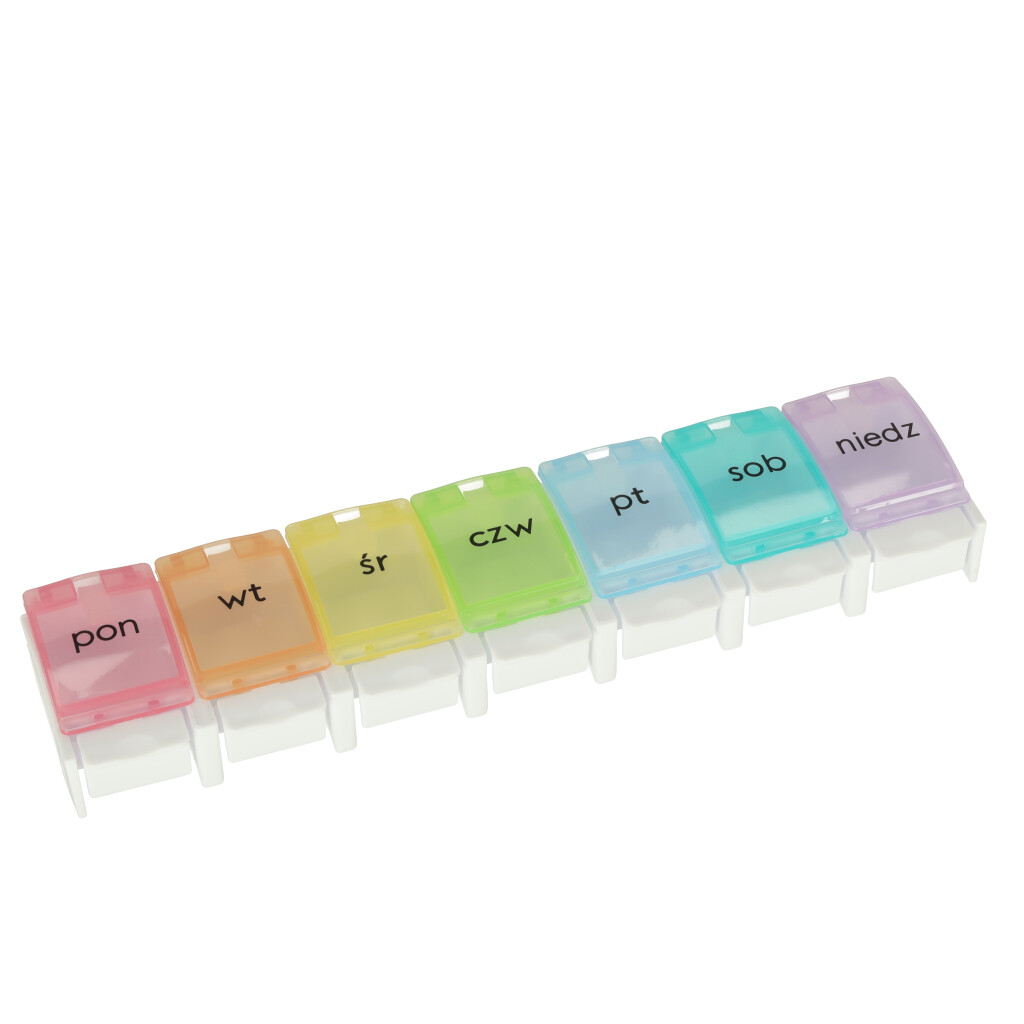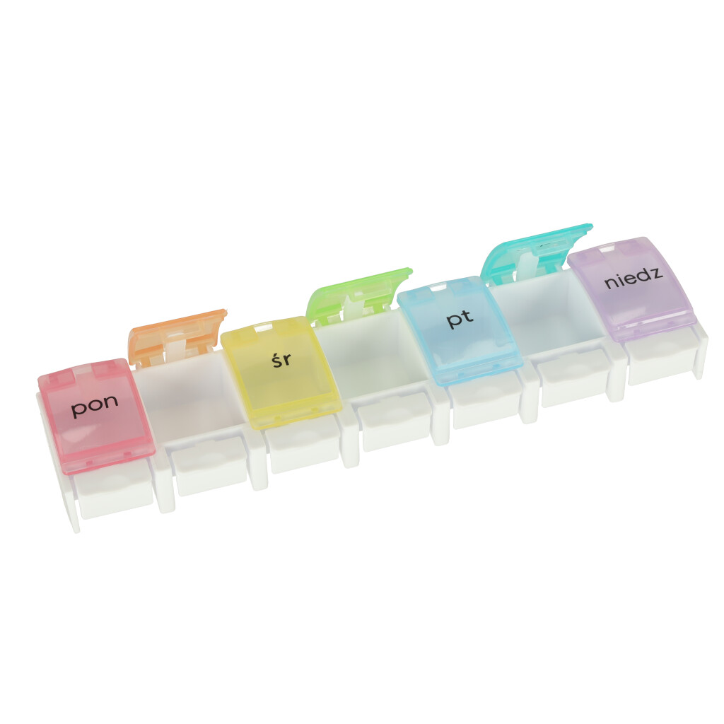 Tygodniowy pojemnik na leki – od teraz pamiętanie o przyjęciu leków będzie dużo łatwiejsze! Pojemnik posiada 7 kolorowych przegród, które są oznaczone nazwami dni tygodnia w języku polskim. Tworzywo: plastik. Wym. całego pojemnika: 12,7 x 6,5 x 3,5 cm.