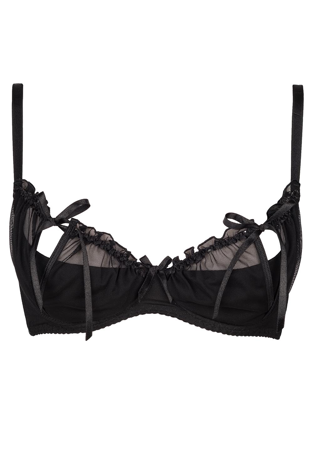 Zmysłowy półbiustonosz Charbon kusi frywolnymi falbankami i kokardkami, wiążącymi atłasową tasiemką niewielkie rozcięcia, odsłaniające część skrytych pod tiulowym woalem piersi. Model posiada dodatkowe fiszbiny pionowe stabilizujące konstrukcję oraz regulowane, nieodpinane ramiączka. Zapinany na dwie hafti. Trójstopniowa regulacja obwodu.