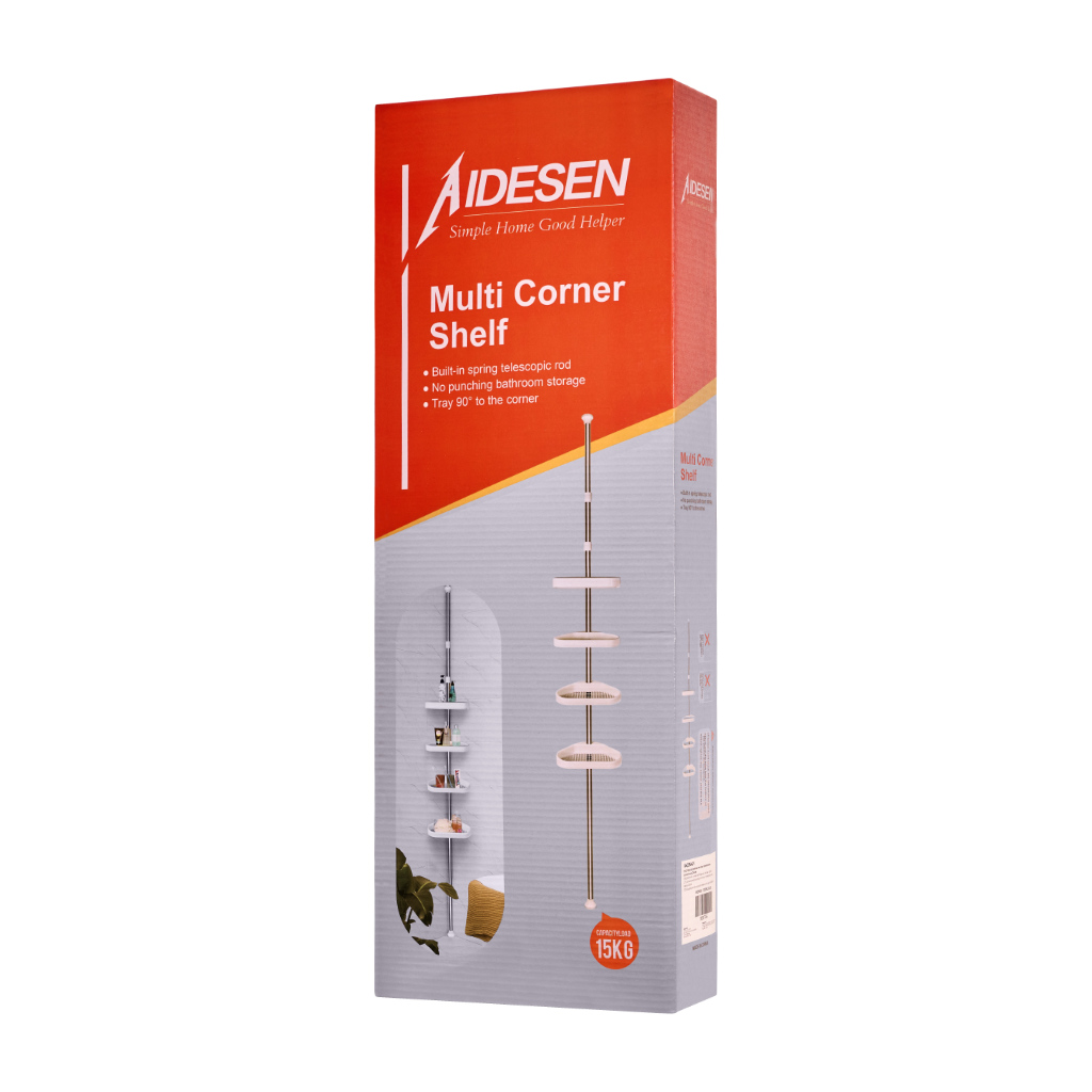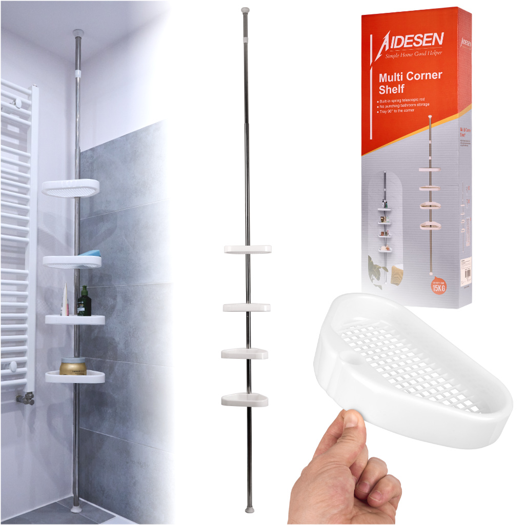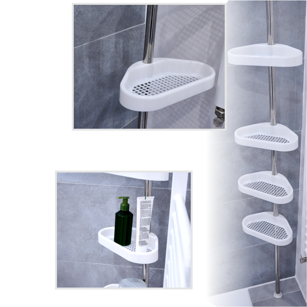 Narożna półka łazienkowa z regulacją wysokości – maksymalna wysokość do 320 cm. Posiada cztery półki na ulubione kosmetyki. Tworzywo: metal, plastik.