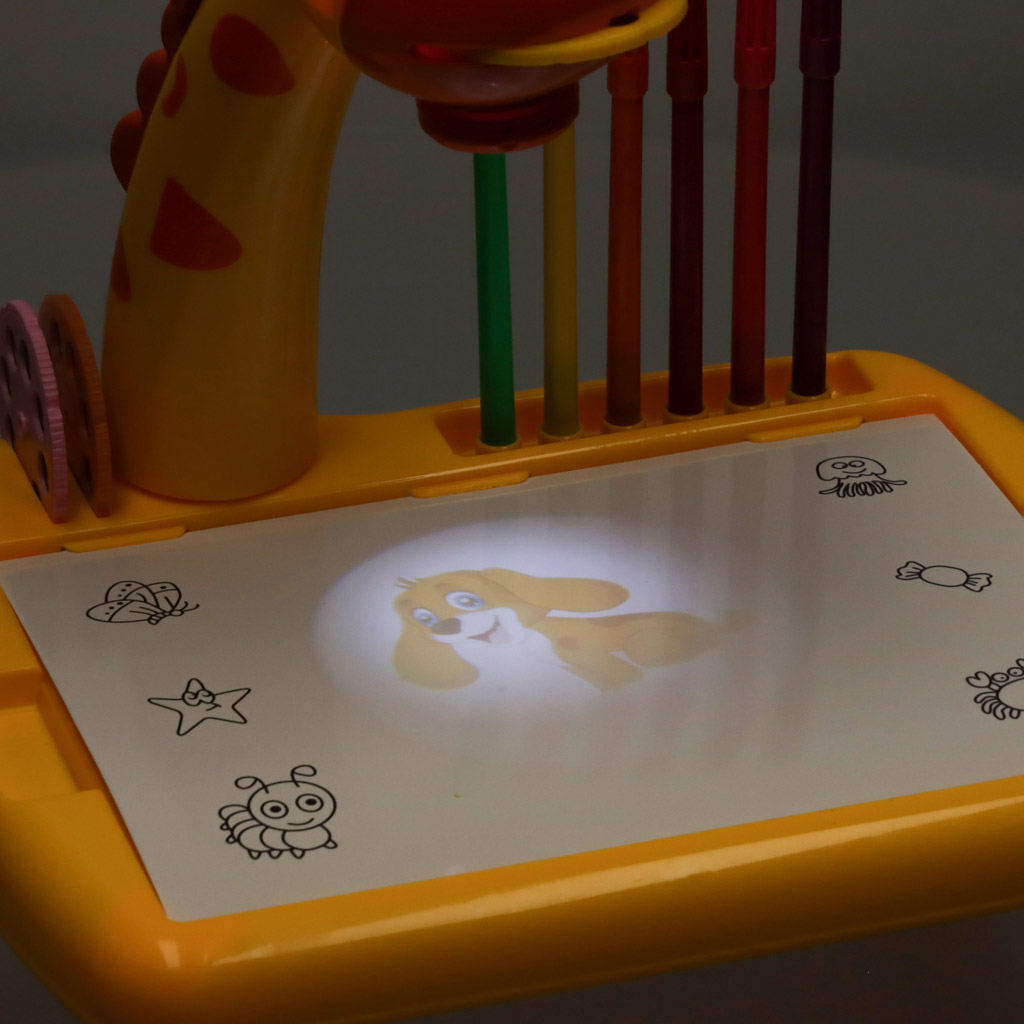 Dziecięcy projektor do rysowania w kształcie żółtej przyjaznej żyrafki. Rysowanie z pomocą rzutnika rozwija zdolności manualne i doskonali umiejętności rysowania. W zestawie są wszystkie niezbędne akcesoria małego artysty. Wymiar: 31 cm x 35 cm x 24 cm.