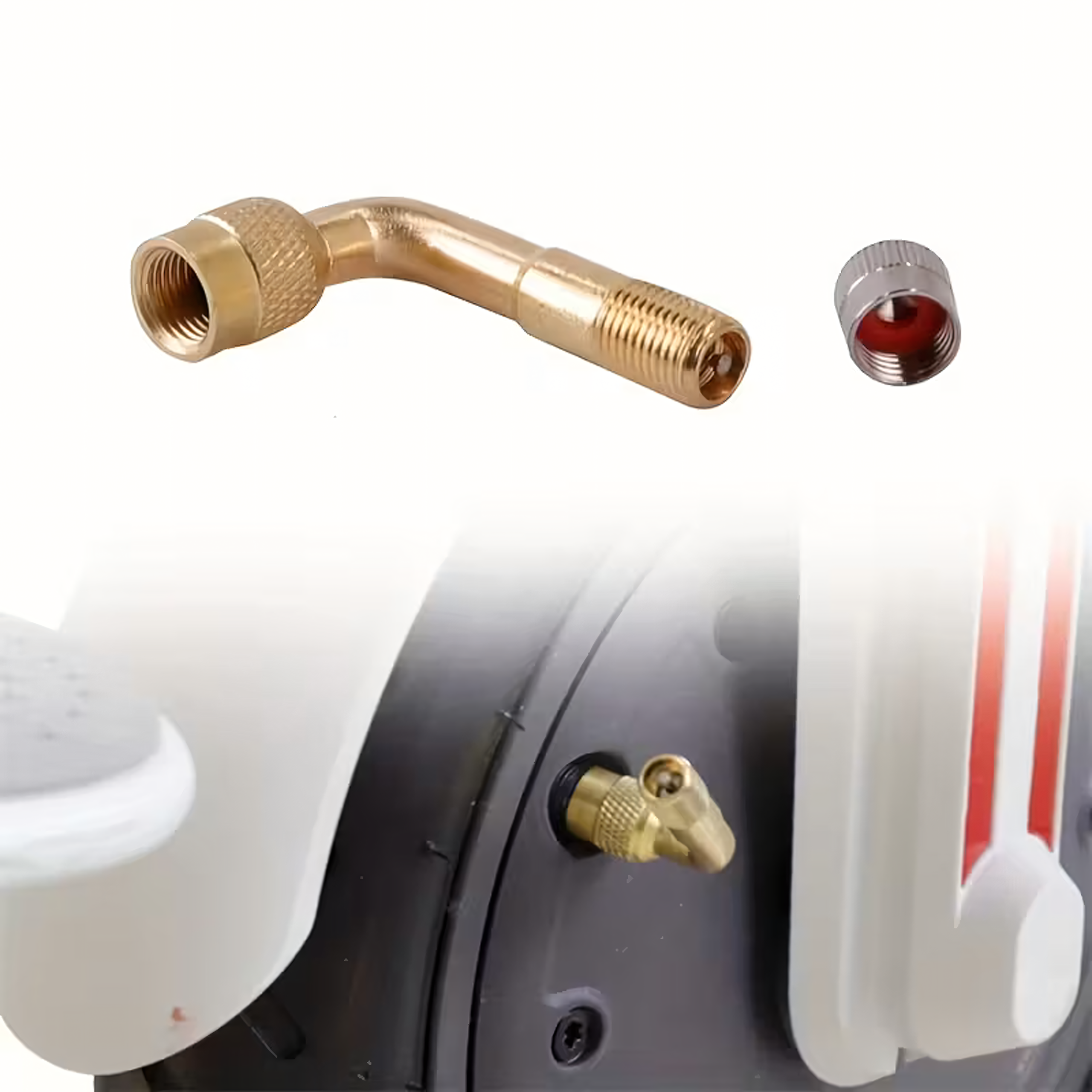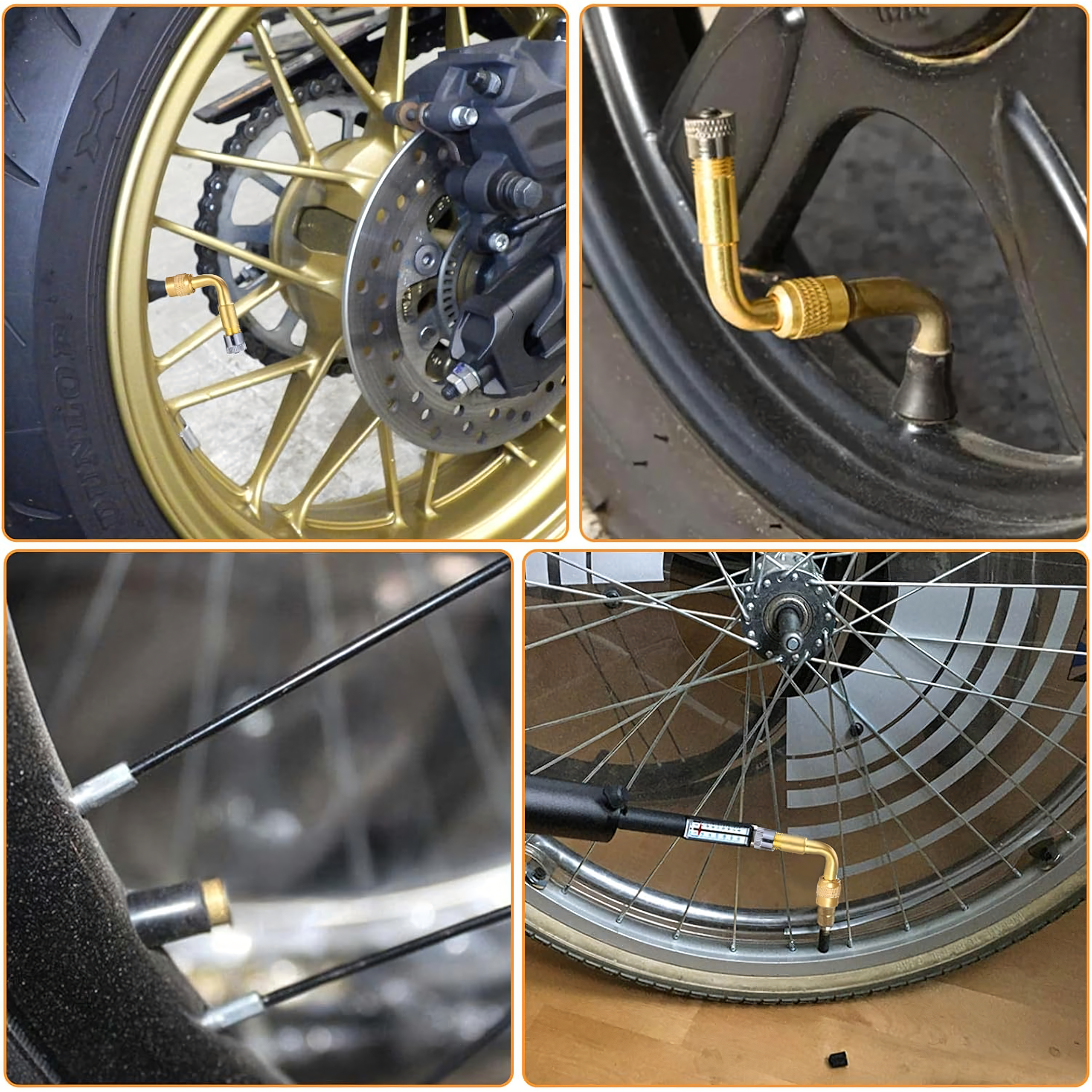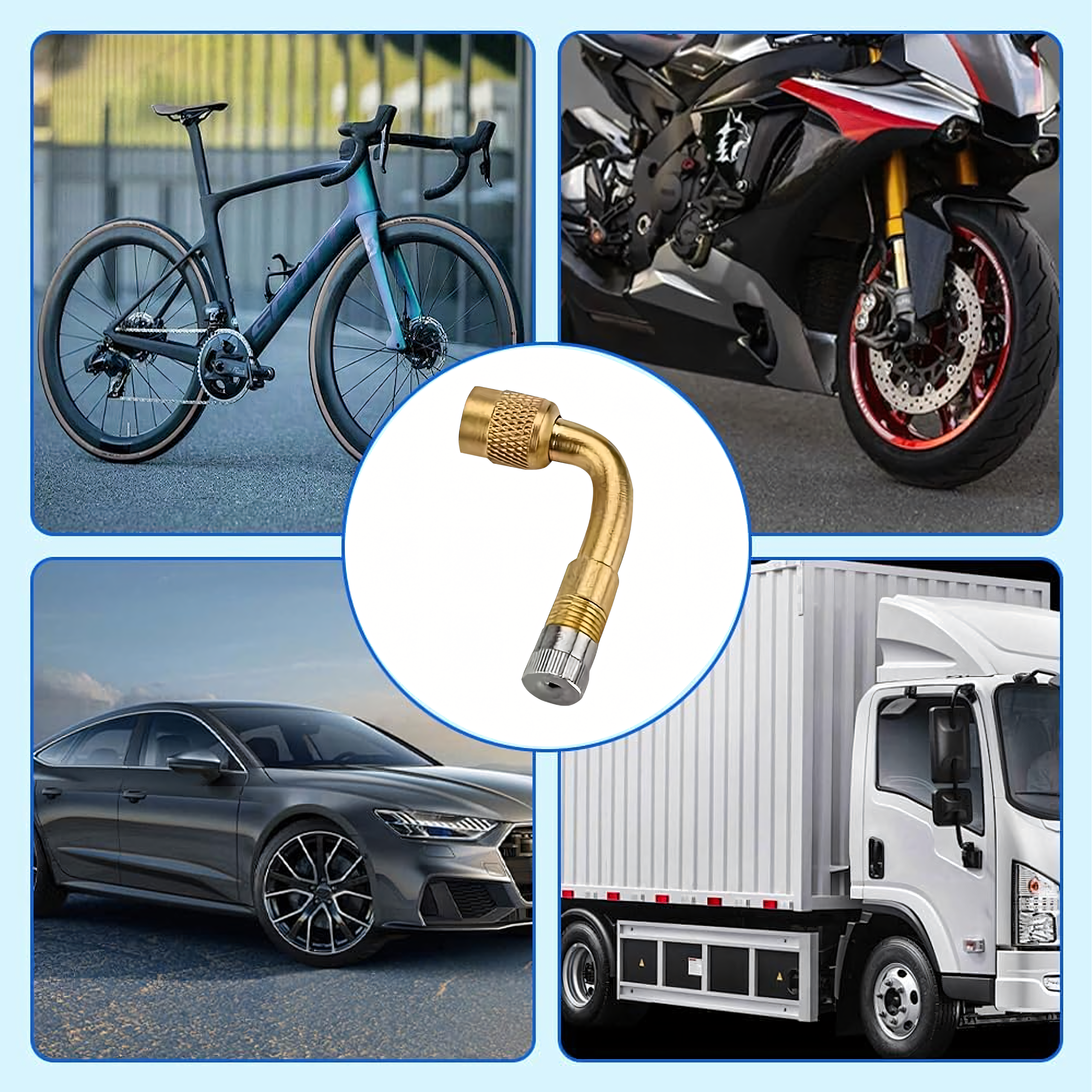 Metalowa przedłużka kątowa 90° to praktyczne i solidne akcesorium, które ułatwia dostęp do trudno położonych wentyli. Idealna do pompowania i kontroli ciśnienia w kołach bliźniaczych samochodów dostawczych, ciężarowych, rowerów, motocykli i autobusów.
