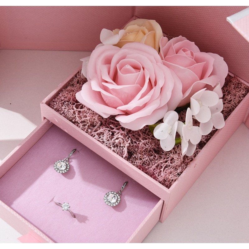Pod przeźroczystą osłonką znajduje się 9 czerwonych mydlanych różyczek. Pudełeczko posiada wysuwaną szufladkę na naszyjnik lub bransoletkę. Wymiary pudełeczka: