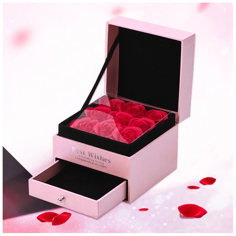 Pod przeźroczystą osłonką znajduje się 9 czerwonych mydlanych różyczek. Pudełeczko posiada wysuwaną szufladkę na naszyjnik lub bransoletkę. Wymiary pudełeczka: