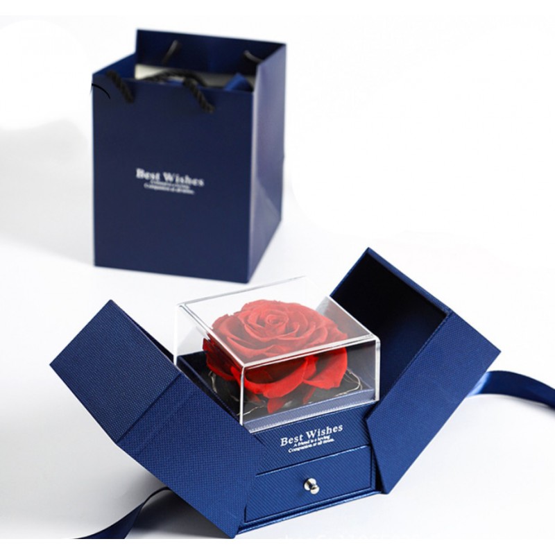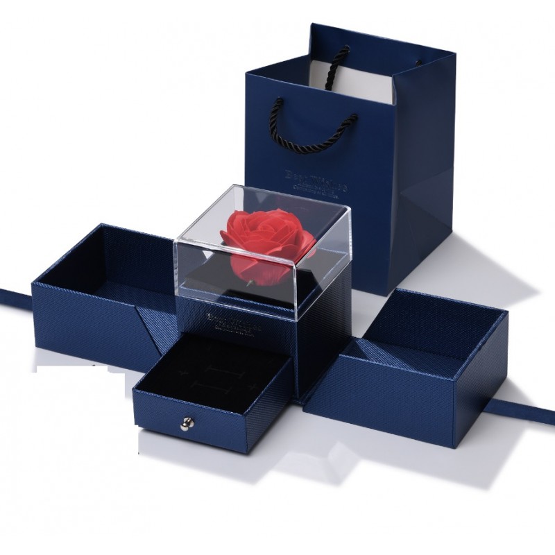 Pod przeźroczystą osłonką znajduje się czerwona mydlana róża. Pudełeczko posiada wysuwaną szufladkę na biżuterię. Wymiary pudełeczka: