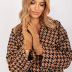 Eleganckie rękawiczki damskie ocieplane wykonane z połączenia dwóch różnych materiałów. Palec wskazujący z haftowanym kwiatkiem, umożliwiający obsługę telefonu, bez potrzeby ściągania rękawiczek.