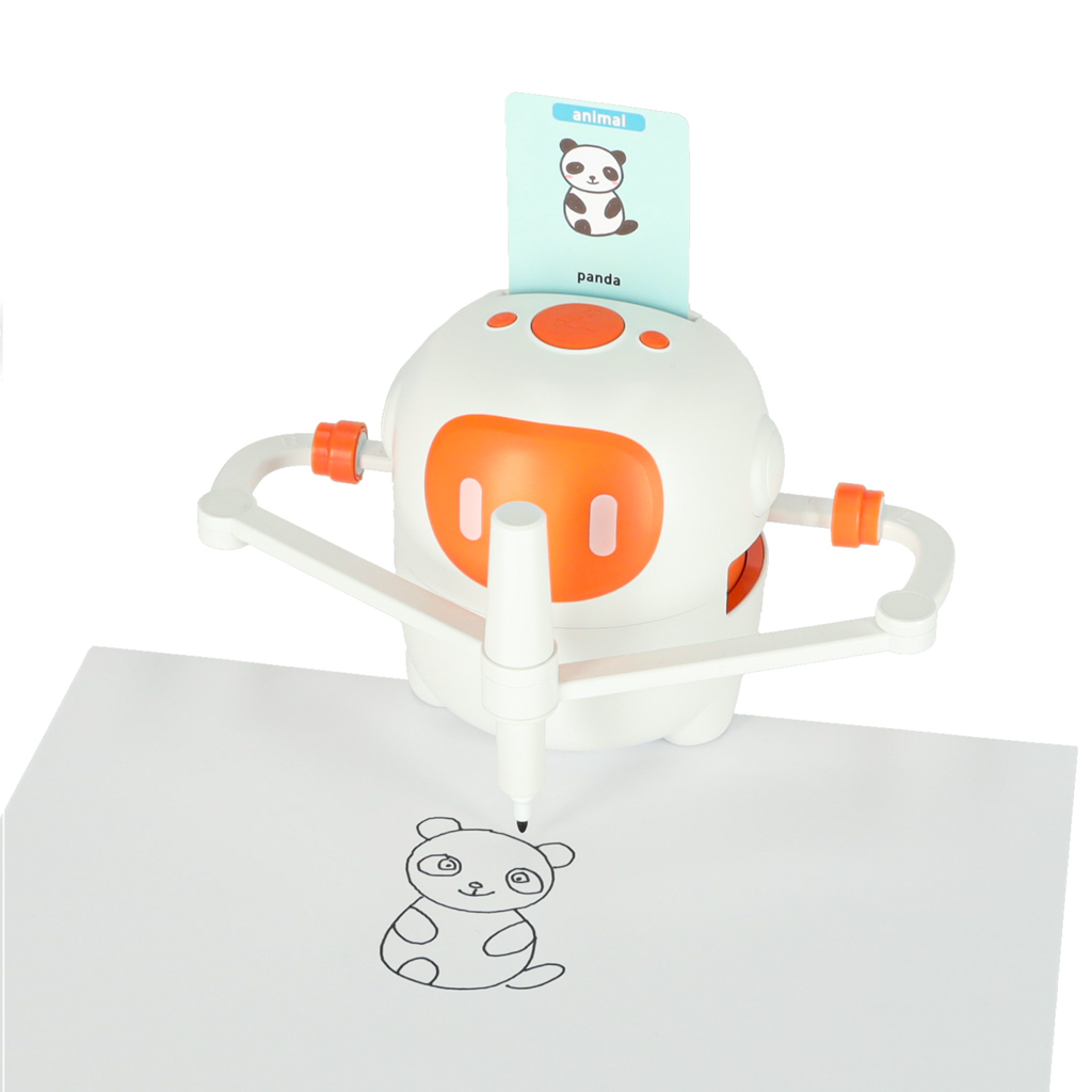 Robot rysujący dla dzieci 3+ z akumulatorem 2400 mAh (ładowanie 4,2 V przez USB). Kolor biało pomarańczowy.Po wsunięciu karty i mazaka automatycznie odtwarza 1 ze 100 wzorów. Obsługa w j. angielskim. Stabilna, gumowa podstawa.
