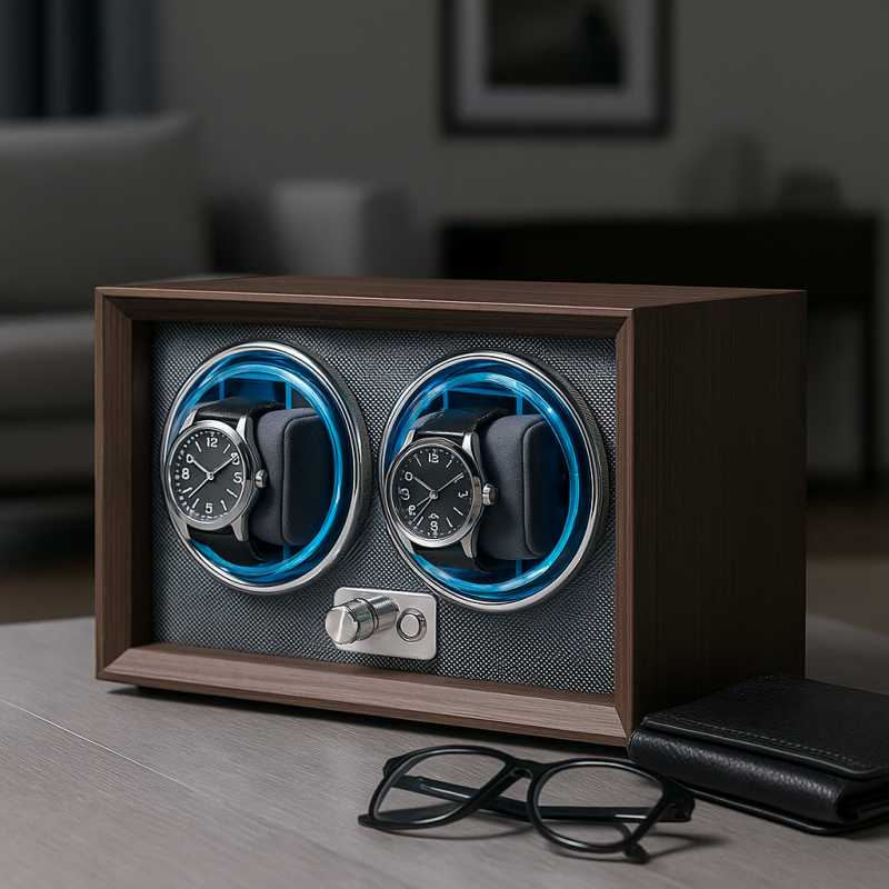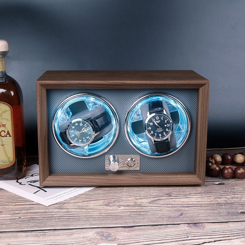Elegancki Rotomat na zegarki mechaniczne z automatycznym naciągiemWystarczy uruchomić rotator aby obracał jednym zegarkiem, drugi uruchamiany po włączeniu dodatkowego trybu.Długość czasu pracy rotomatu zależna od ustawionego trybu.Cechy produktu:- niewielkie gabaryty- wbudowany, niemal bezgłośny silnik elektryczny- wnętrze wyścielone miękką ekoskórą oraz tworzywem sztucznym- elegancka obudowa imitująca drewno- podłączenie poprzez kabel USB (brak zasilacza w zestawie)- ambientowe podświetlanie LED w kolorze niebieskim – możliwość wyłączenia podświetlenia- 4 tryby obracania zegarków- W zestawie instrukcja obsługi w języku polskimWymiary:23,7 x 12,4 x 15,2 cm