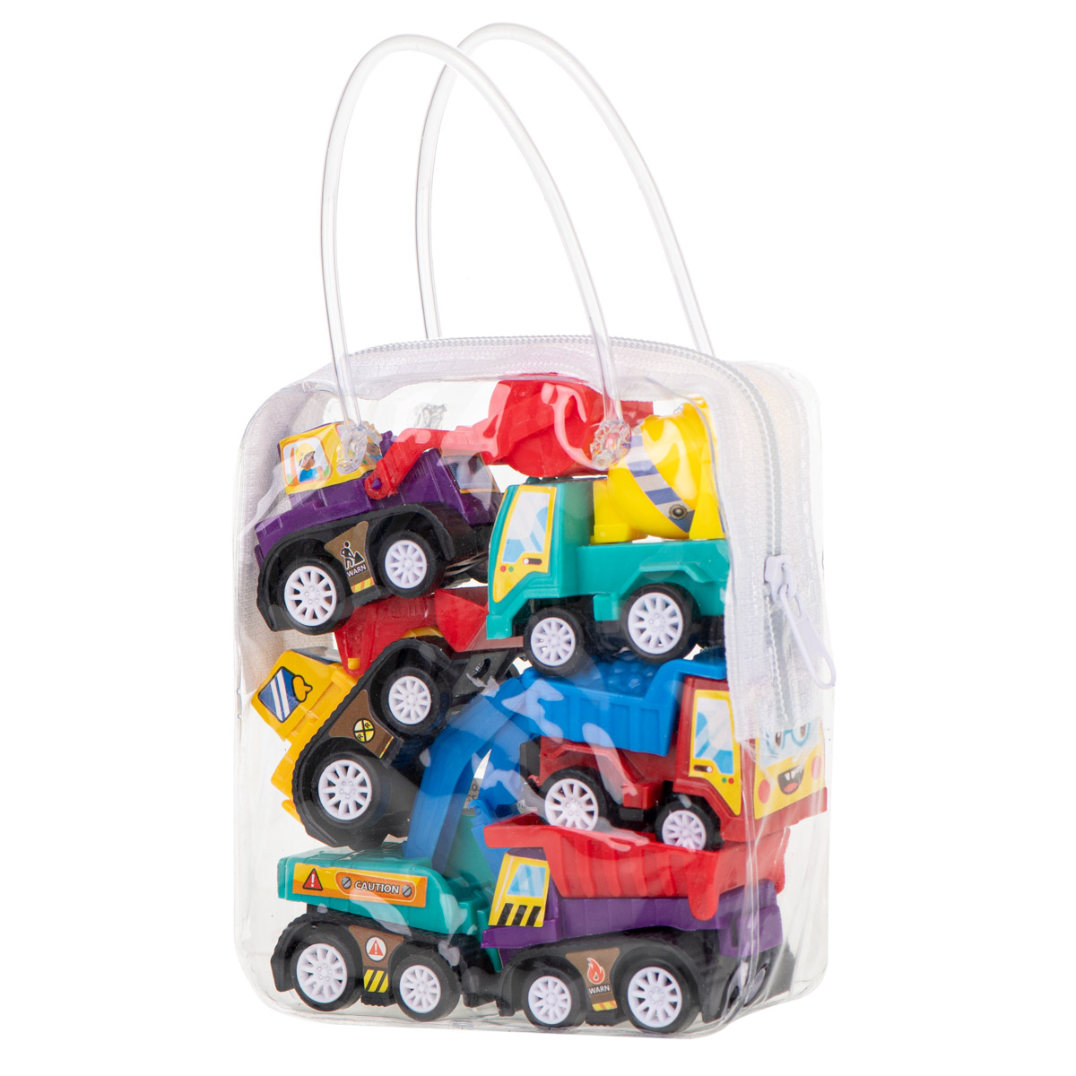 Zestaw samochodów z napędem. Wielokolorowe samochody budowlane posiadają ruchome elementy, które uatrakcyjniają zabawę. Zestaw zawiera m.in betoniarkę, walec. Zapakowane w foliowe opakowanie z zamkiem. Wymiary auta:5x4x3cm (opakowania: 10x11x3cm)