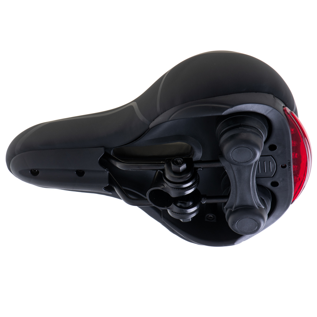 Wygodne siodełko rowerowe z lampką LED z tyłu. Wypełnienie z pianki zapewniającej doskonały komfort podczas jazdy. Zasilanie: bateria CR2023 (w zestawie). Źródło światła: 5LED. Tworzywo: aluminium, plastik, poliester. Wymiary siodełka: 28 x 21 x 11cm.