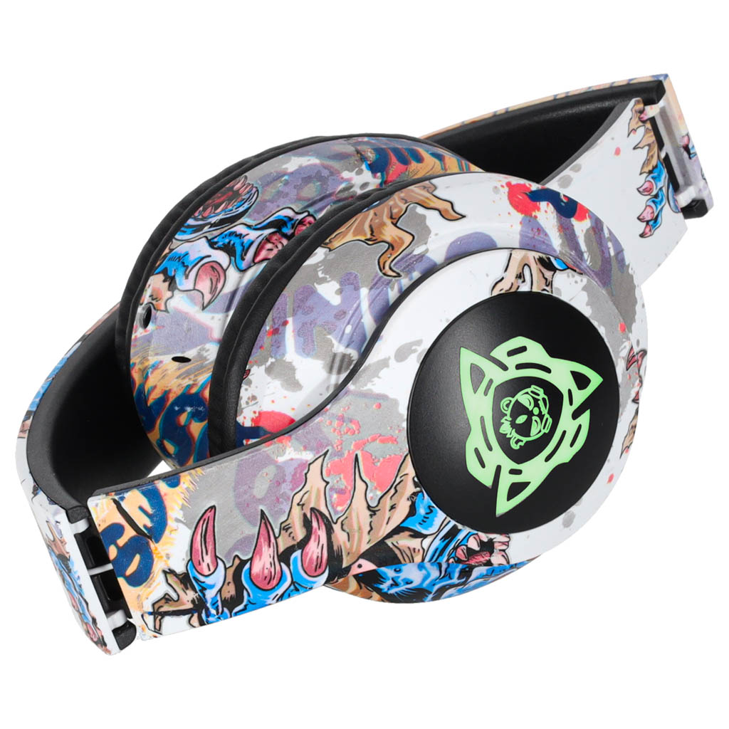 Nauszne słuchawki z podświetleniem RGB i wejściem micro SD. Można nimi sterować za pomocą przycisków, zmieniając poziom głośności lub utwór na playliście. Wbudowany mikrofon pozwala swobodnie rozmawiać przez telefon. Wymiary: 17,5 cm x 20 cm x 9 cm