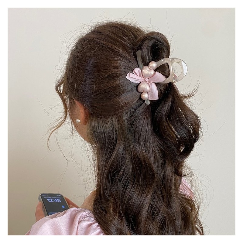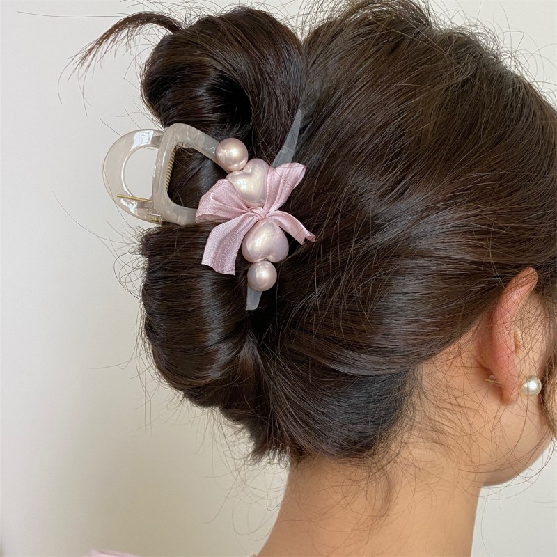 Spinka klamra do włosów XL kokarda i perłowe SERCA róż 8x6cm SP372