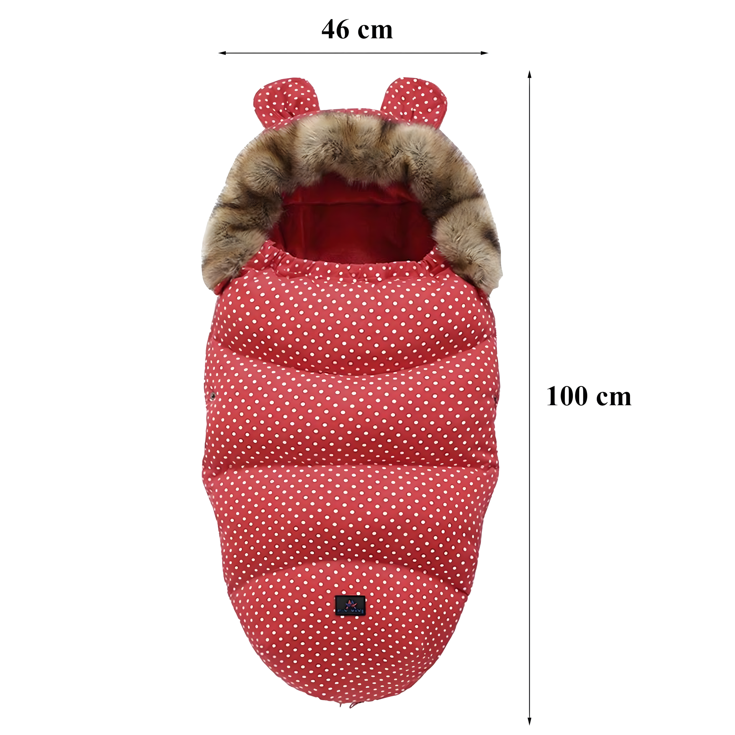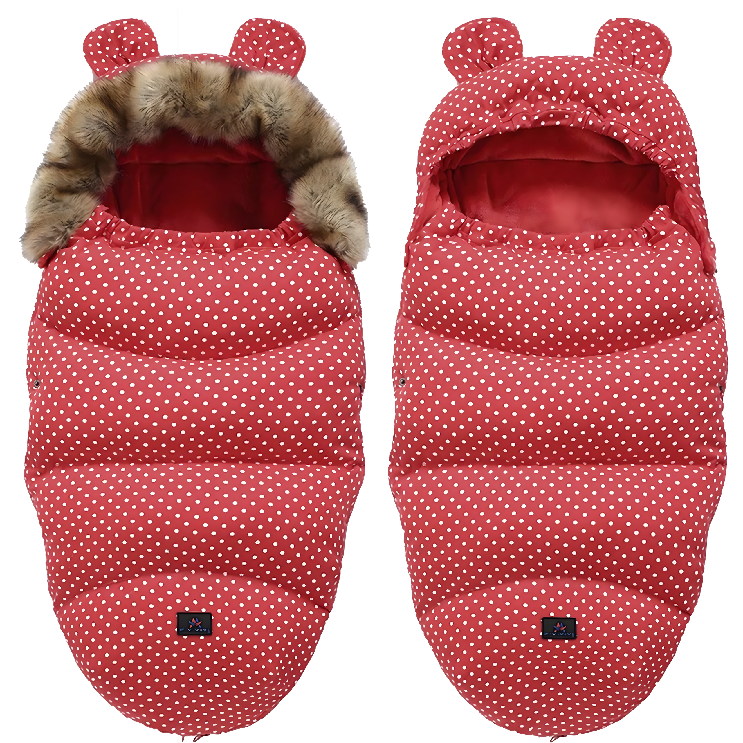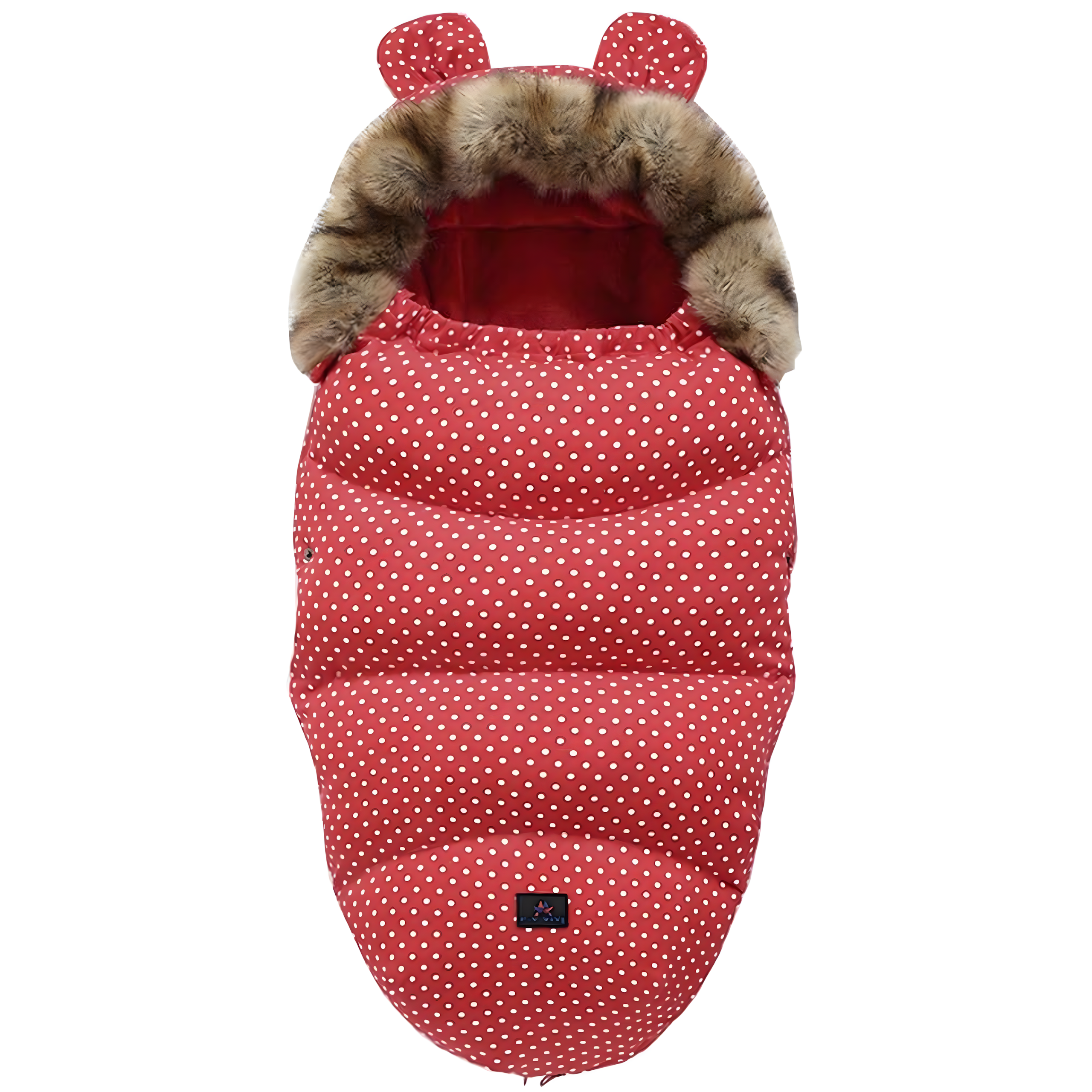 Kaptur śpiworka posiada futerko, które chroni maleństwo przed zimnym wiatrem i mroźnym śniegiem. Materiał zewnętrzny jest wodoodporny, a wypełnienie utrzymuje ciepło wewnątrz, co sprawia, że śpiwór jest idealnym rozwiązaniem na zimne dni.